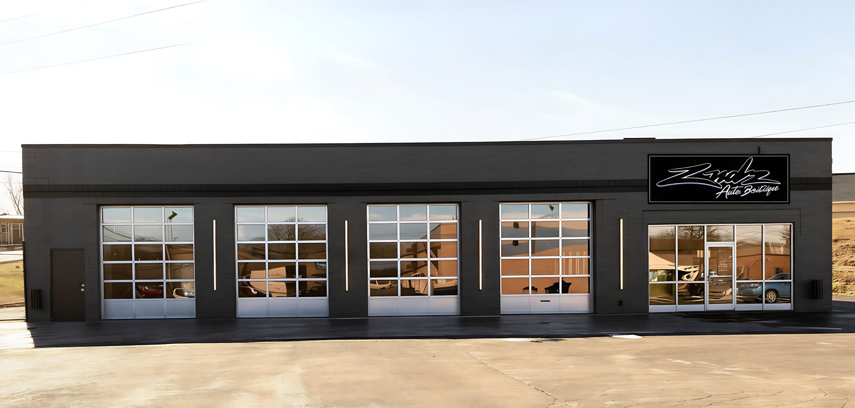 change time of day to late dusk add warm lighting to the vertical lights between the garage doors and also as backlighting around the logo sign make reflection in garage door windows much dimmer and less busy