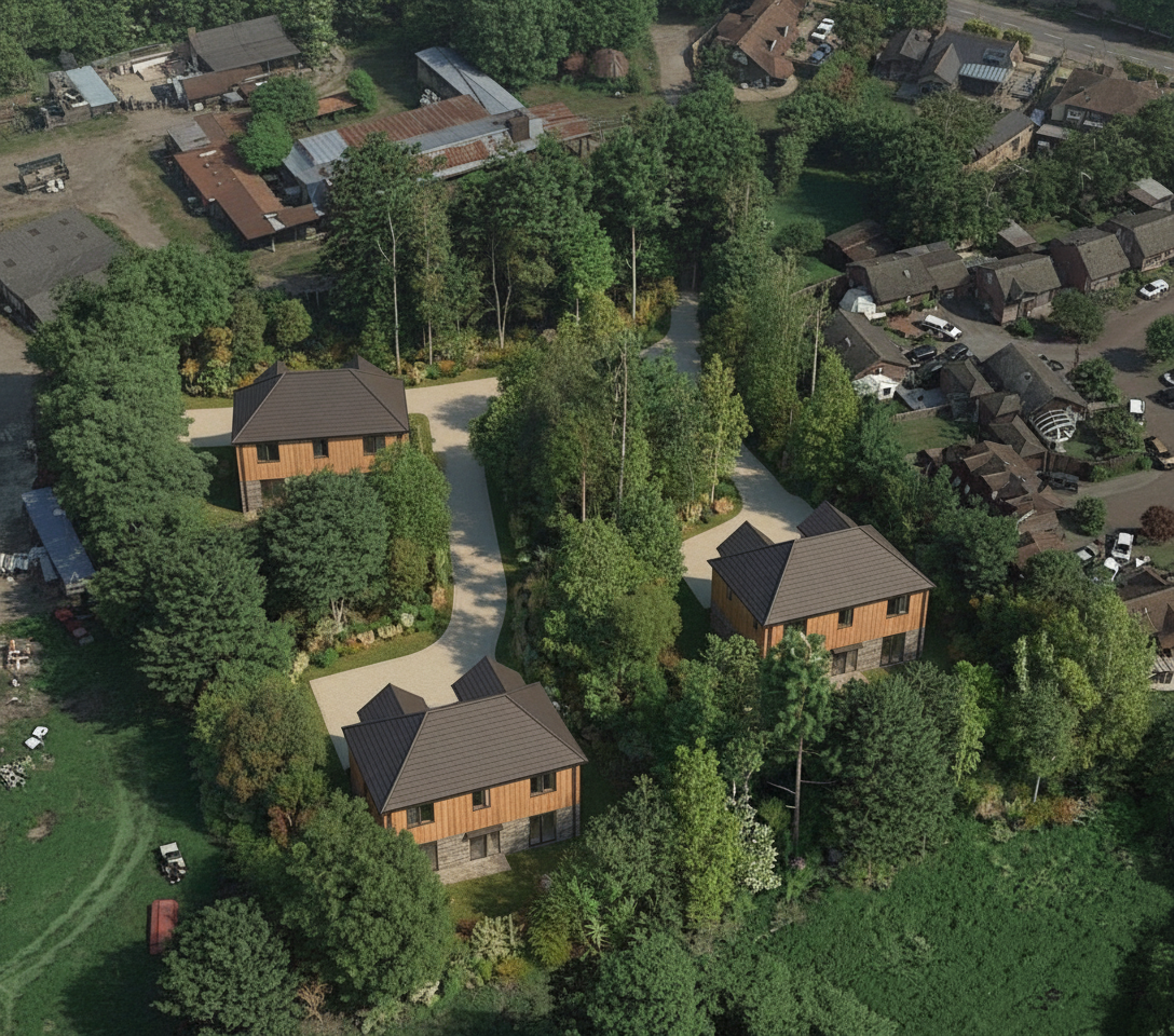 increase the height of the surrounding houses so they are two storey houses do not change the 3 new houses within the woodland