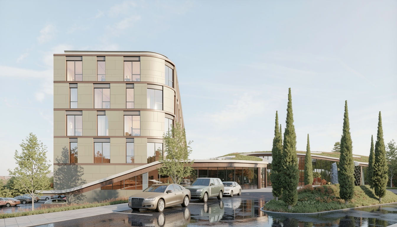 important preserve the existing geometry and the existing context exactly as provided preserve the existing windows do not add new windows do not modify alter reinterpret add remove scale or reshape any geometry do not change the site surroundings street layout neighboring buildings vegetation or context elements do not modify geometry scale proportions buildings road layout sidewalks or surrounding context in any way do not modify text soft sunny noon atmosphere diffused neutral natural daylight with subtle tones cinematic architectural mood weak interior lighting 4000k slight glowing from inside large glass surfaces with realistic reflections soft mirror effect environmental reflections of sky and surroundings important do not add new windows remove the people make the asphalt darker