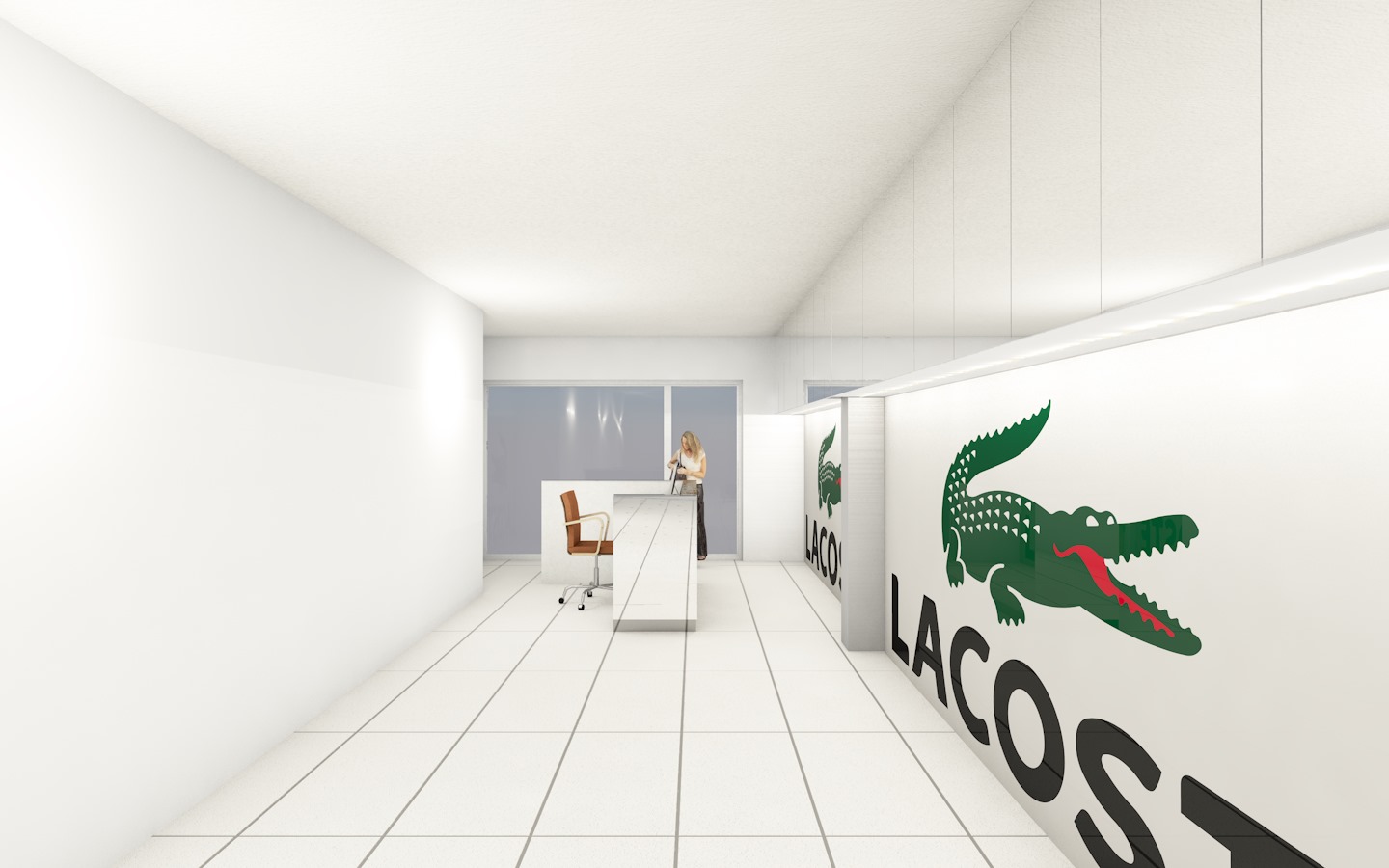 modern lacoste store interior with wall mounted mirrored cabinets and a sleek stainless steel inox reception desk minimalist clothing racks neutral colors with green accents bright airy lighting with soft spotlights photorealistic high detail render realistic reflections wide angle view from entrance remove hangers and clothes