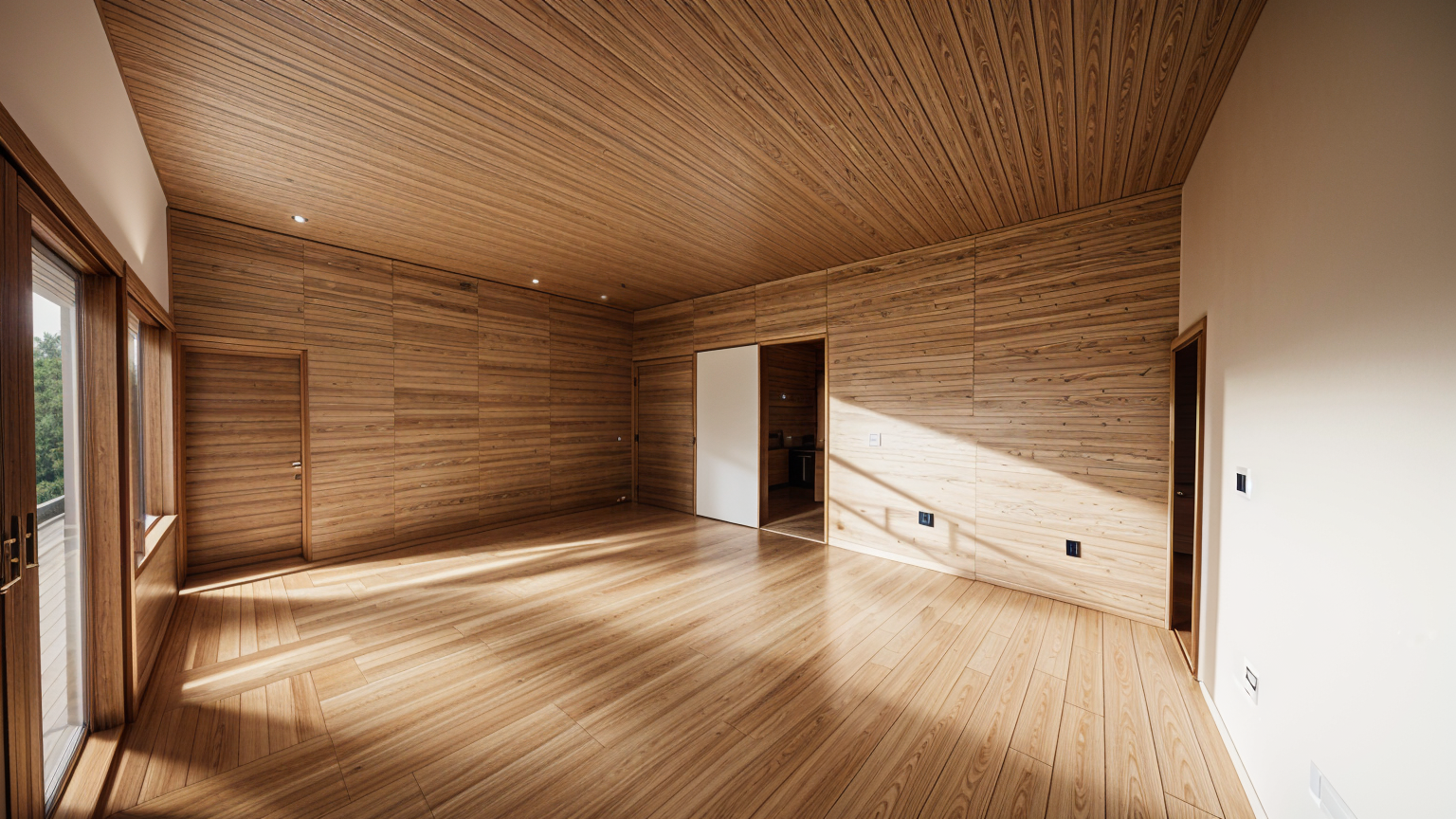 a modern architectural design of an elongated one story building with a flat roof featuring large glass windows framed with light wood the walls are a smooth white complemented by wooden accents surround the building with lush green grass and tall leafy trees with a vibrant green hue the sky is a clear soft blue creating a peaceful and serene atmosphere architecture