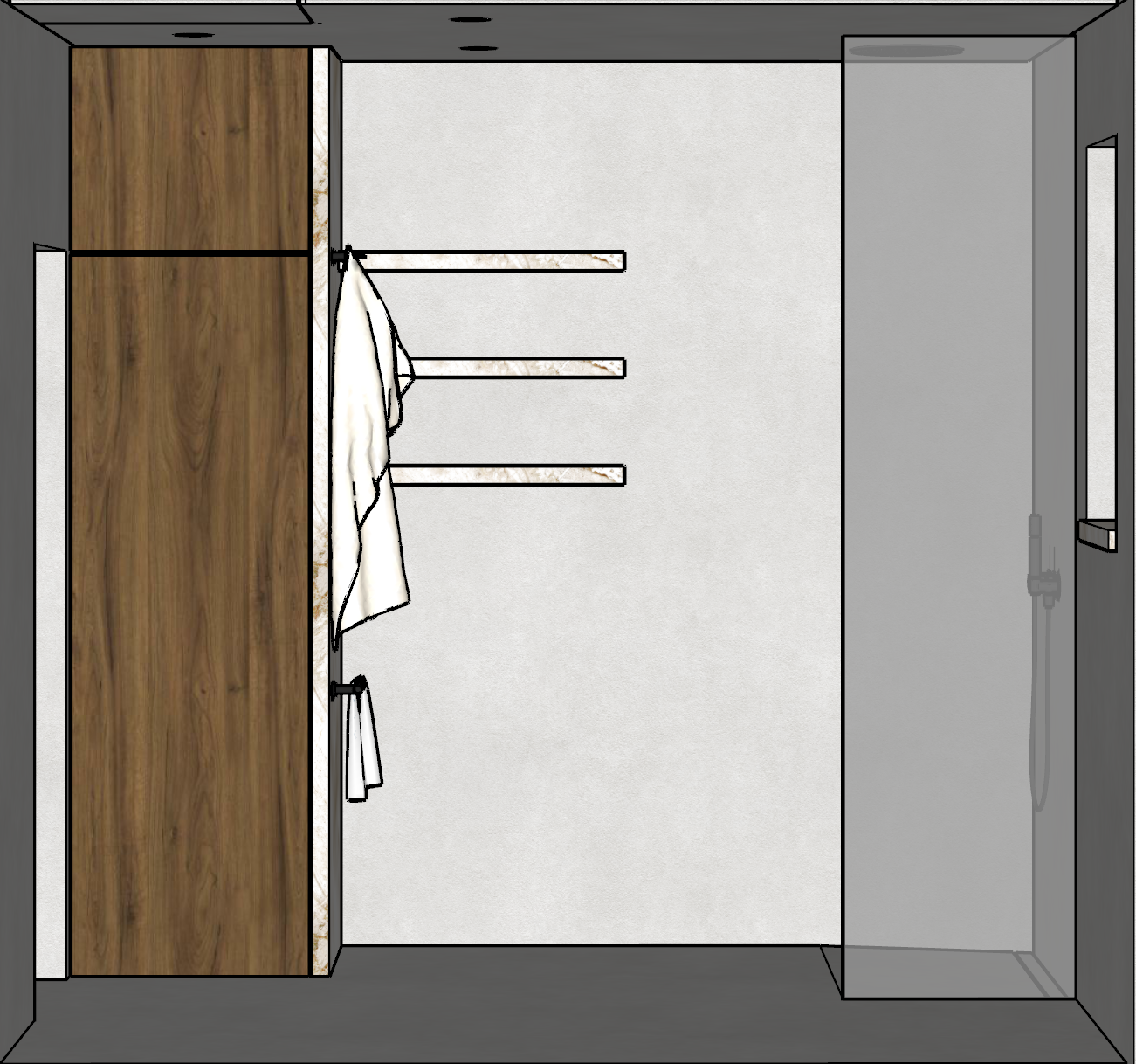 photorealistic image minimalistic bathroom walls and floor from light white beige microcement washbasin from marble cabinet from natural oak veneer