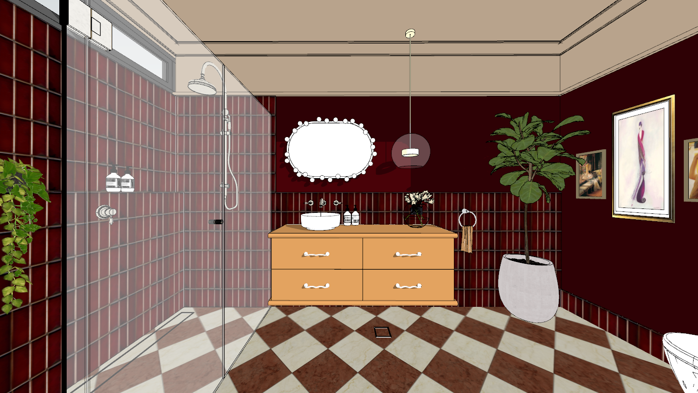 render me the photo keeping exactly everyhting where it is and vanity is a flat colour not timber tapware is aged gold