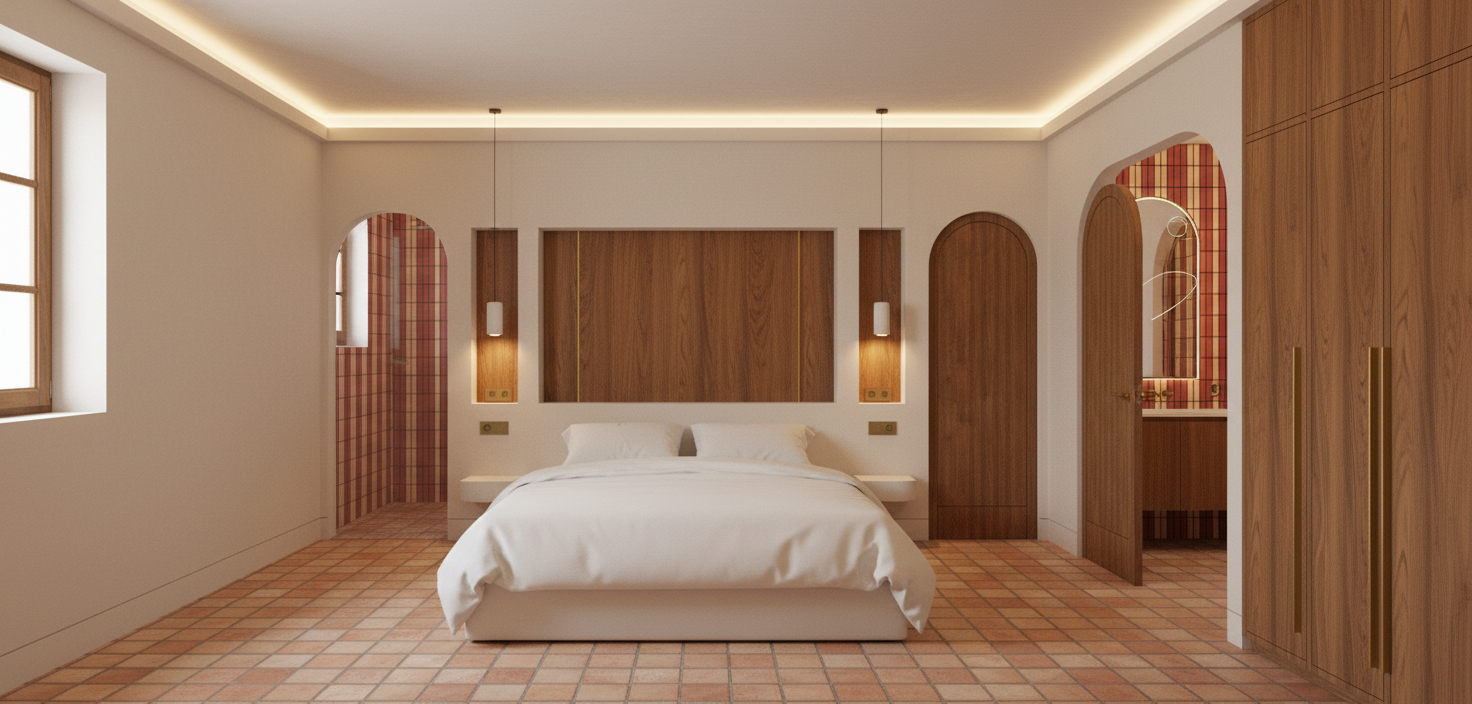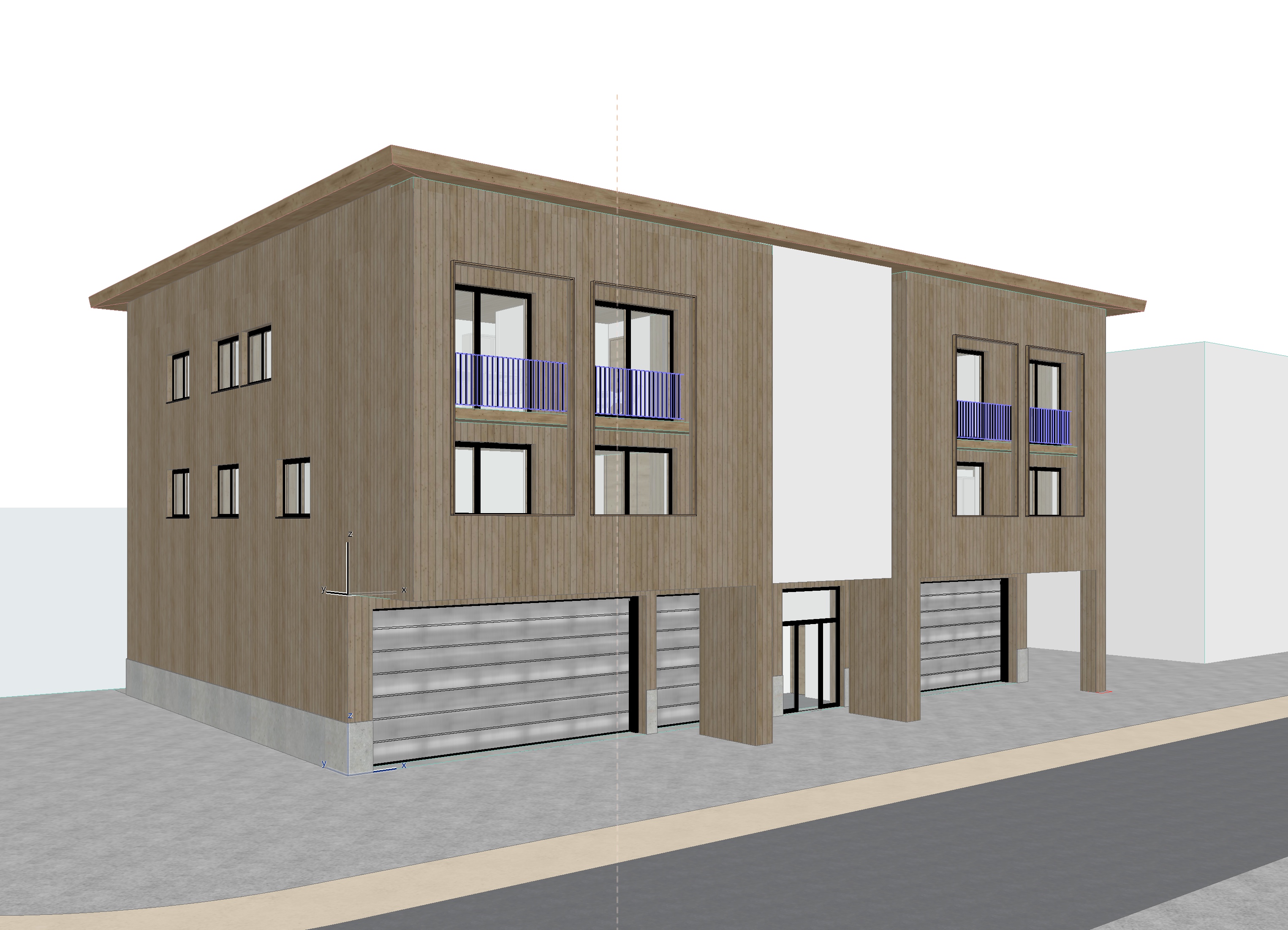a modern two story building with a wooden facade featuring large windows use warm amber tones for the wood reflecting a cozy inviting atmosphere the window frames are a sleek charcoal black providing a contemporary contrast the garage doors are a soft gray blending seamlessly with a minimalist design the sidewalk and driveway are a light stone color contributing to an elegant urban setting the sky is clear with a soft pastel blue tone creating a serene and sunny ambiance include a small artistic sculpture in the front yard in brushed bronze adding a touch of sophistication