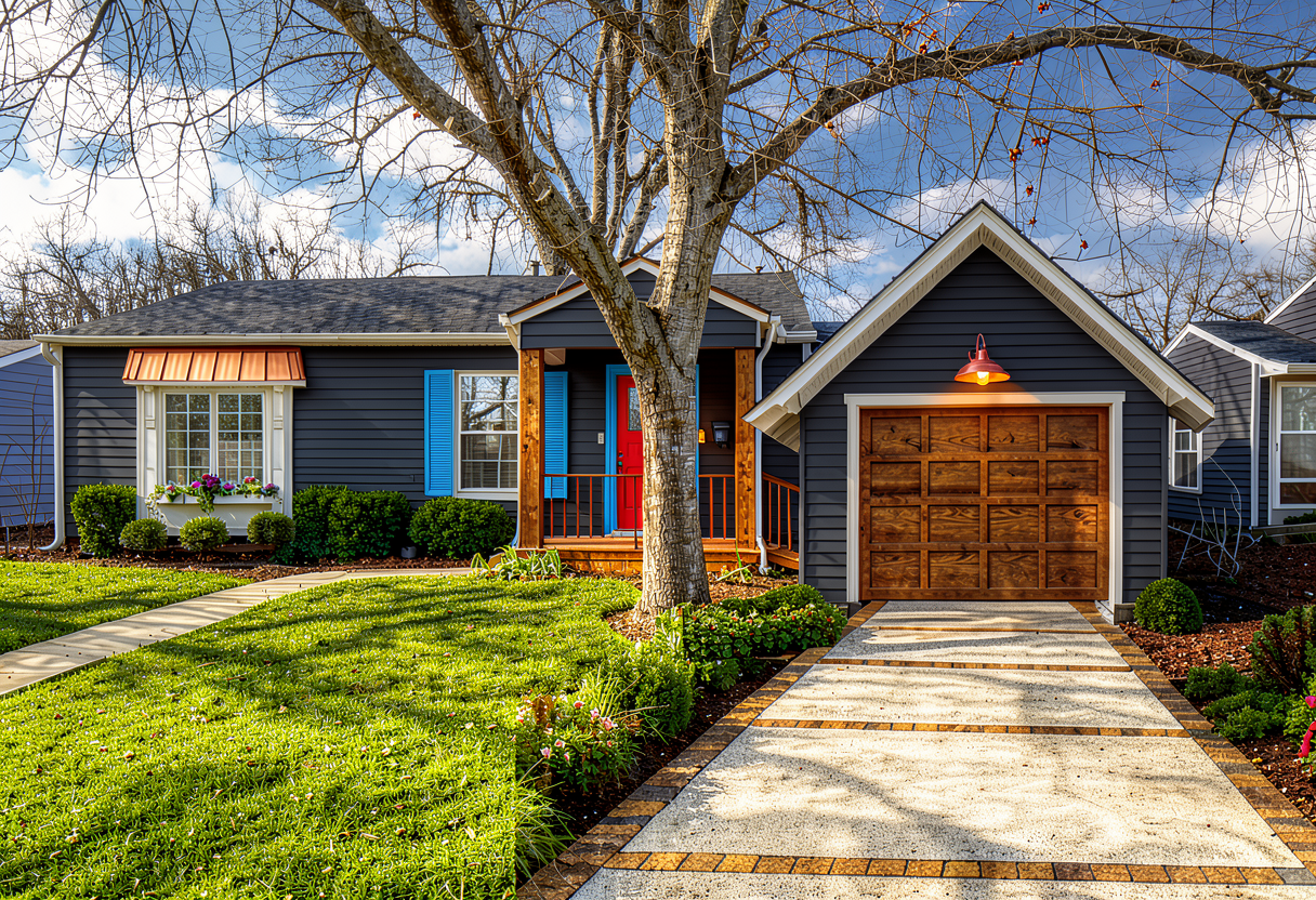 realistic image dusk sky outside turn on exterior and interior lights lush landscaping exterior walls whitewashed brick white painted panel columns white railings white frames at windows gray shake roof warmer lights more lush landscaping slightly lighter sky make border wall brick veneer to match the house