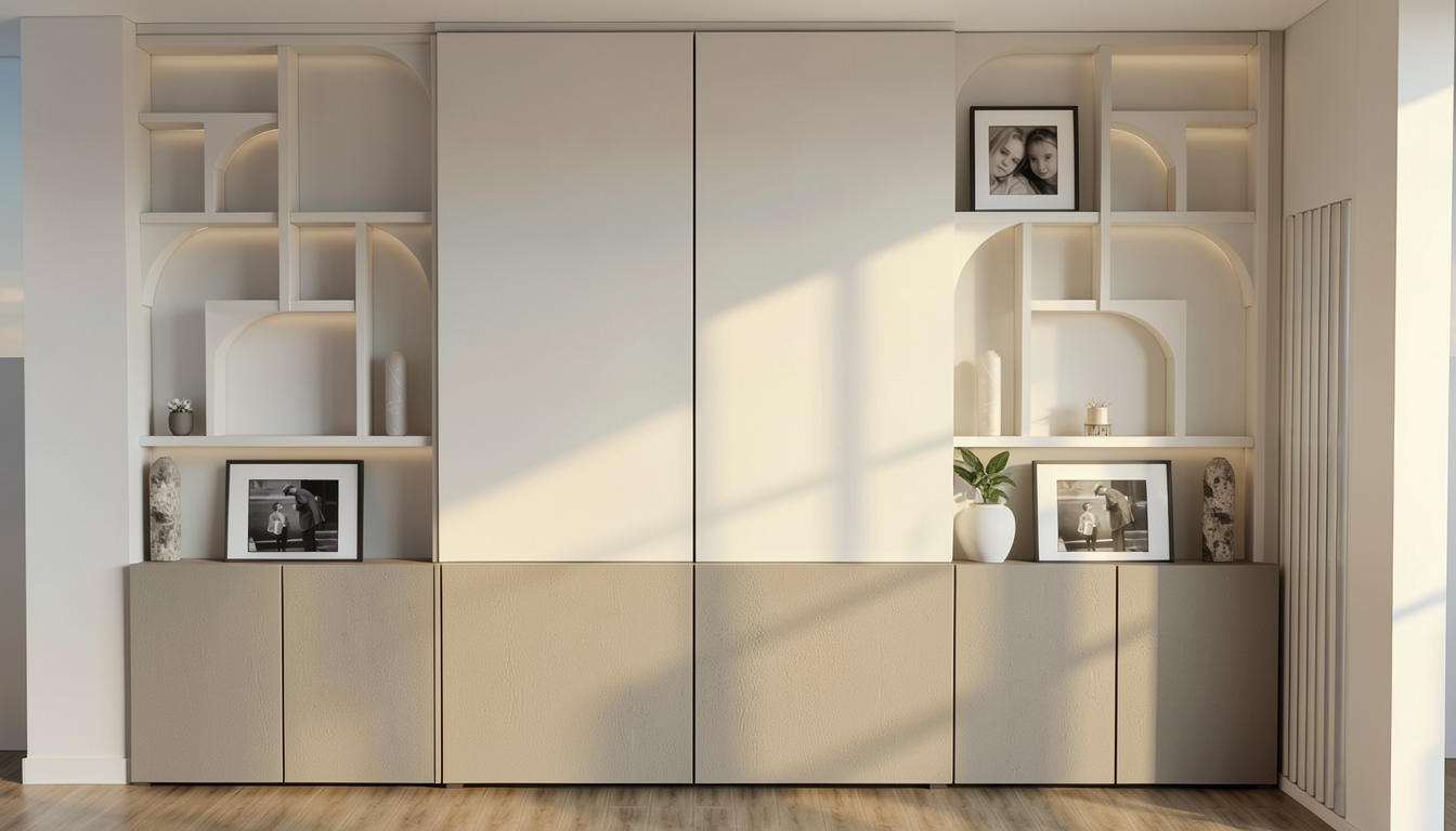 replace the two existing totems with refined sculptural forms inspired by western zhou dynasty bronze ritual vessels specifically the elegance and proportions of a traditional he wine ewer the forms must feel archaeological ceremonial and dignified no humanoid silhouettes no modern figurative abstraction compact balanced body with subtle swelling volume gently curved profile soft shoulder line minimal but refined handle reference integrated into the silhouette abstracted not literal surface finish dark aged bronze with subtle natural patina variations fine incised geometric motifs inspired by early zhou ornamentation very subtle no heavy taotie exaggeration the proportions must feel grounded and noble not tall and slender maintain perfect symmetry and alignment with the wall panels keep lighting architecture wood panels circular wall element furniture and camera exactly as they are only replace the two sculptural objects the result must feel museum quality timeless elegant and culturally authentic