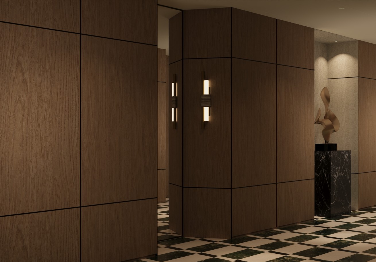 transform the provided corridor interior image into a high end photorealistic render with high end sophisticated warm moody lighting expressing luxury atmosphere while keeping everything exactly the same there is no sunlight or natural light and no windows keep all architectural elements colors and design as they are do not change or add anything different from the design provided enhance lighting keep marble block black the flooring is beige and dark olive or army green marble same pattern as the image wall paper are light grayish beige keep wood color the same medium brown wood no cartoonish look keep overall atmosphere moody sophisticated and realistic make wood lighter reduce exposure reduce shadow effect and contrast increase overall brightness of the image the metal part of wall light is gold reduce exposure just a little reduce brightness a little remove natural light on the right side keep only artificial lighting