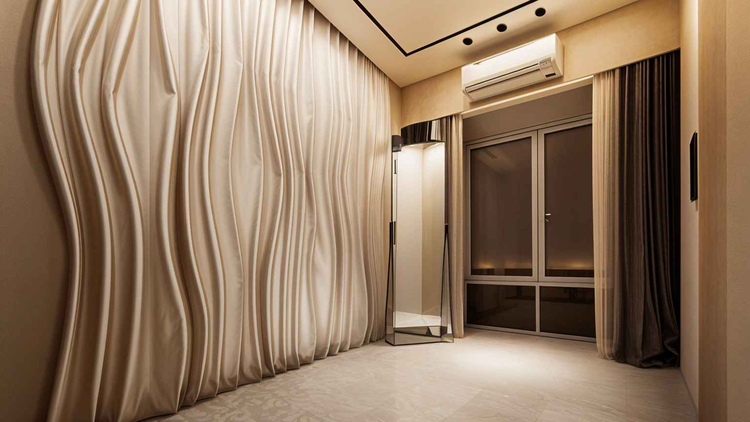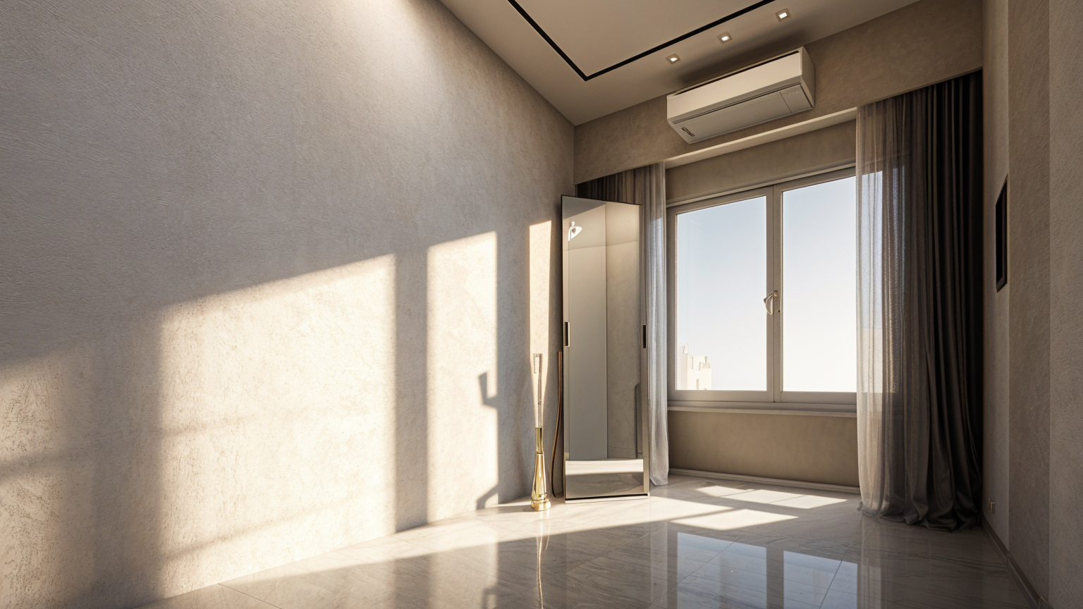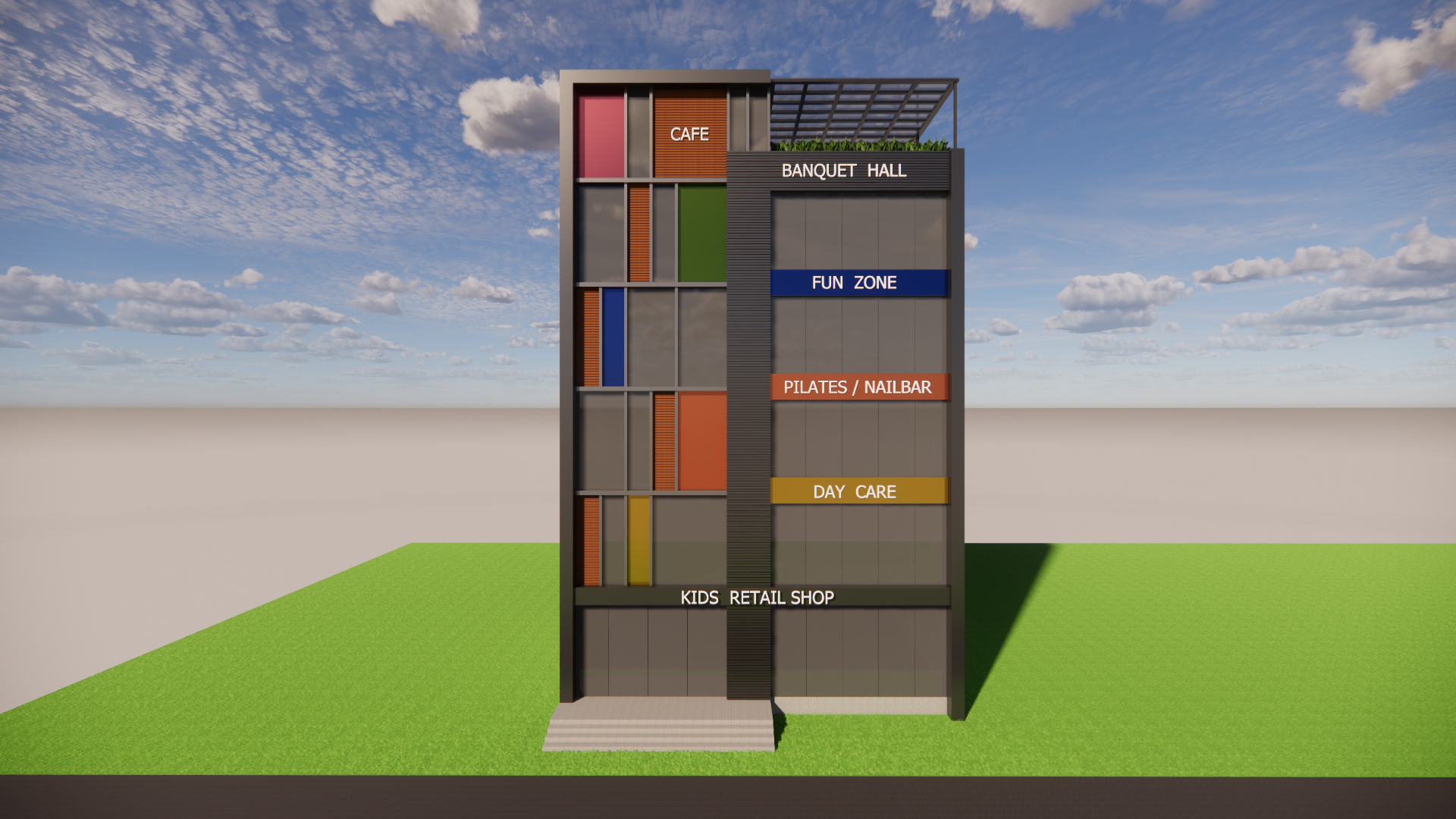 be my 3d visualizer and improve this render add subtle suburb environment around the building the glass transparency should be increased and show internal lights visible from the outside through the glass reduce the sunlight intensity and give a soft look add some trees beside the building