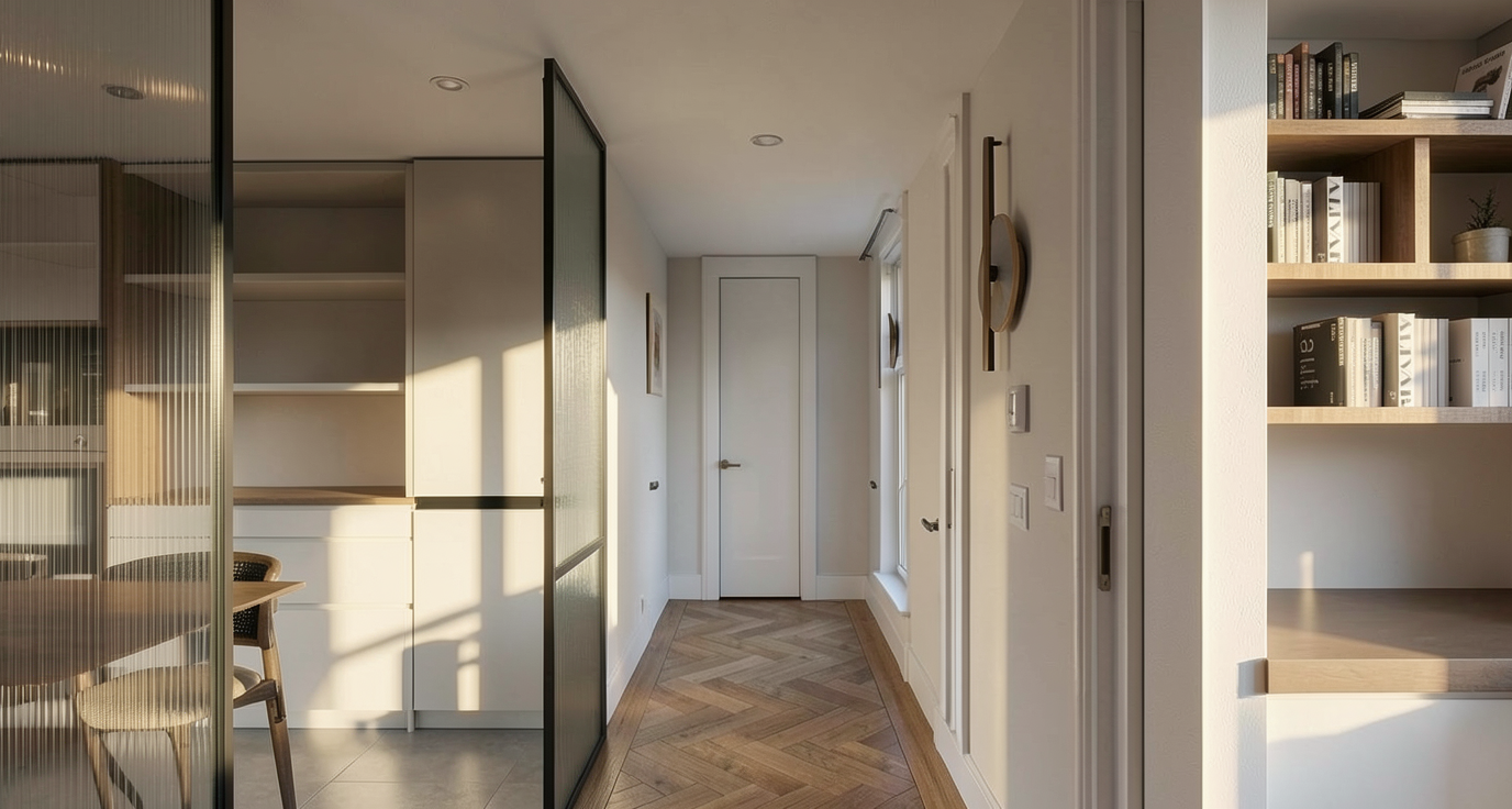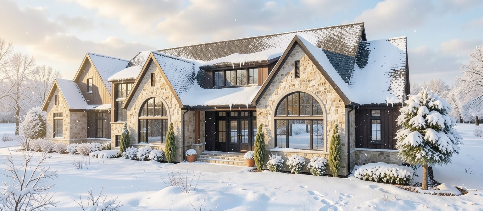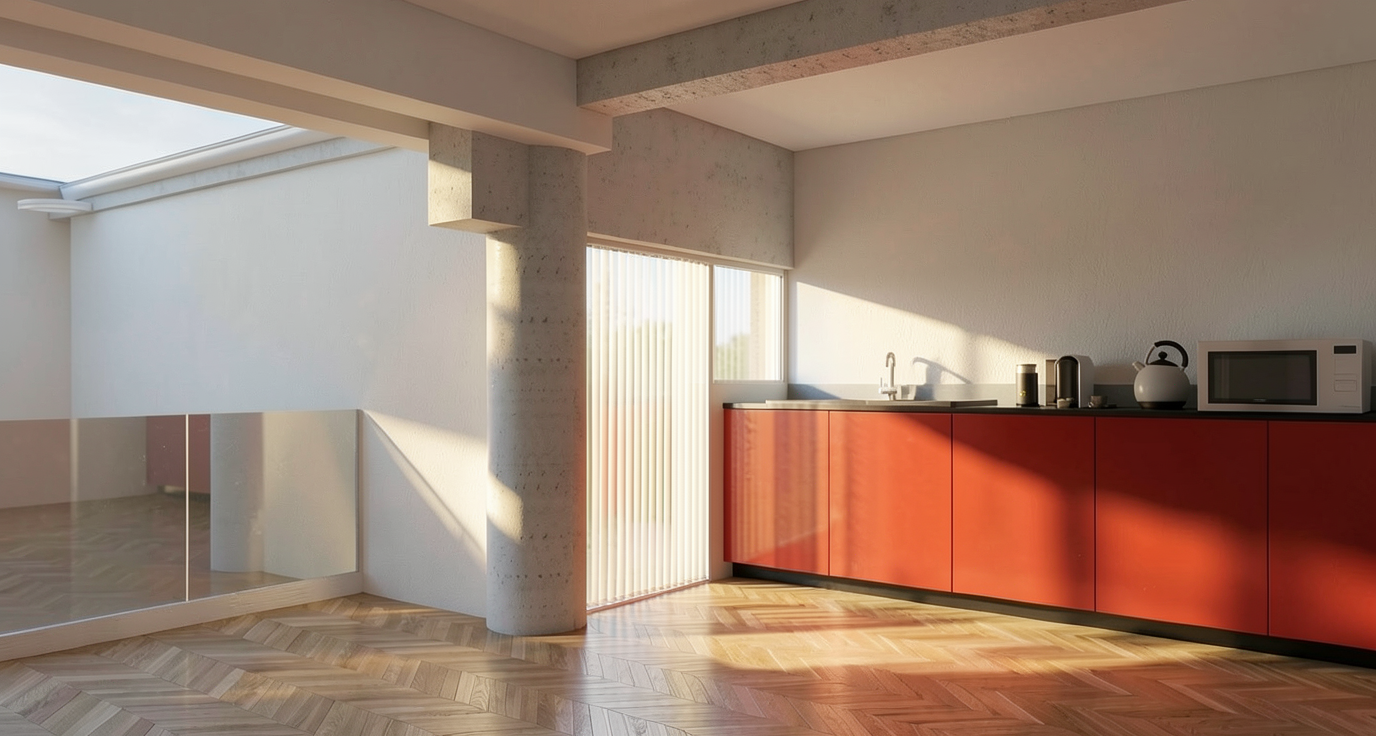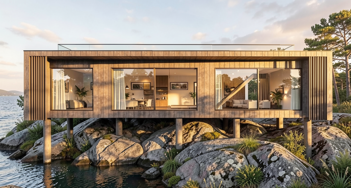 important preserve the existing geometry and the existing context exactly as provided do not modify alter reinterpret add remove scale or reshape any geometry do not change the site surroundings street layout neighboring buildings vegetation or context elements do not modify geometry scale proportions buildings road layout sidewalks or surrounding context in any way do not change text photorealistic architectural rendering clean and balanced contrast calm cinematic mood style contemporary european residential architecture minimalist premium understated do not alter the church color soft overcast noon atmosphere diffused natural daylight with subtle blue grey tones cinematic architectural mood large glass surfaces with realistic reflections soft mirror effect subtle environmental reflections of sky and surroundings wet pavement with smooth reflective surface soft light bounce and blurred reflections high dynamic range lighting realistic global illumination soft shadows calm and minimalist nordic mood photorealistic architectural visualization balanced exposure no harsh highlights add interior warm light do not modify text add motion blur to the carsdo not add people in the foregrounddo not alter the white lines from the pavementdo not alter the crosswalkdo not alter the reddo not alter the motion lines do not alter the facade material
