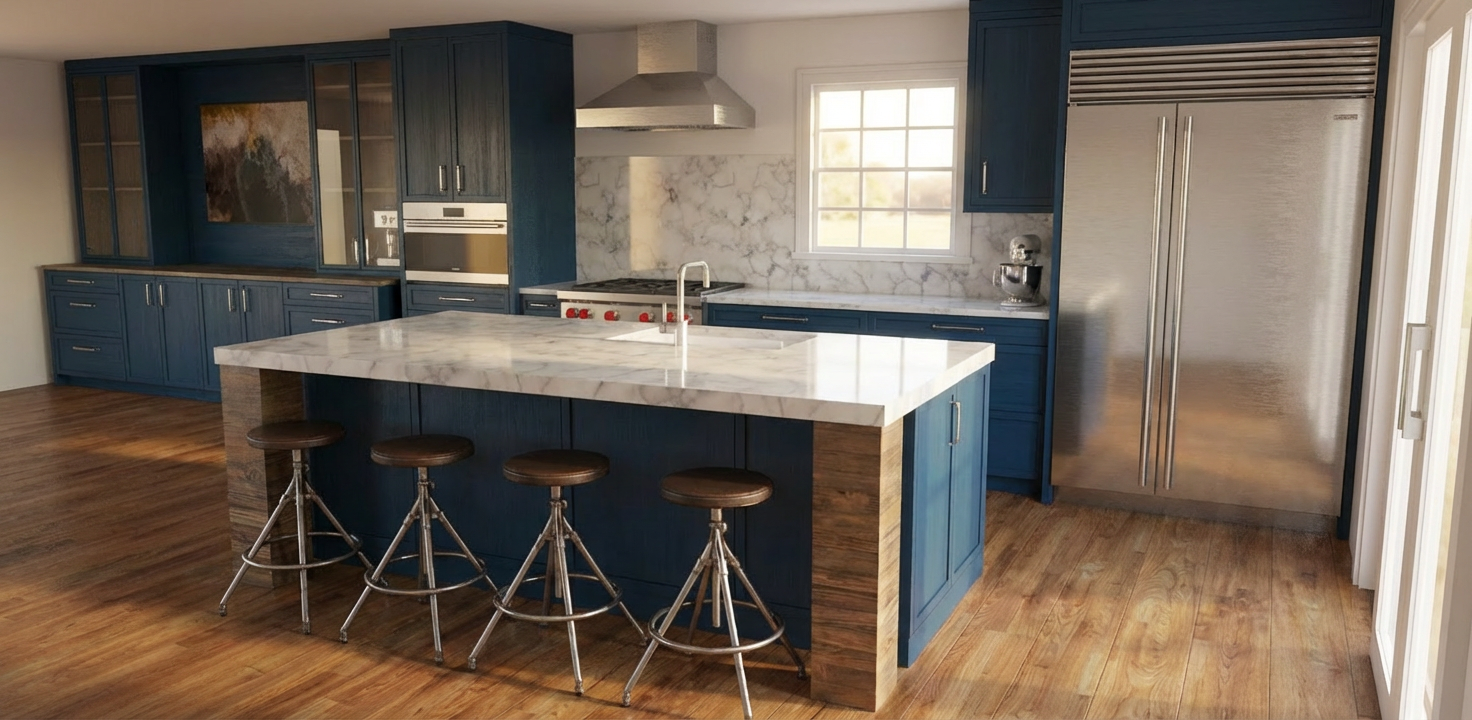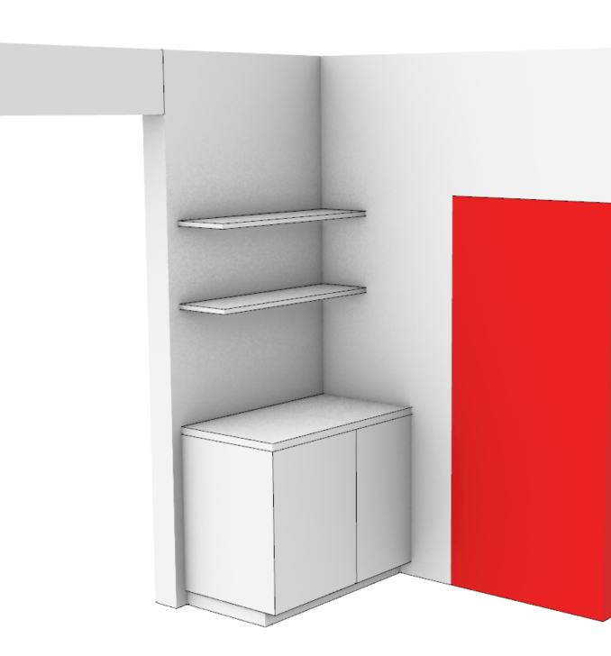 create a photorealistic interior rendering based on the provided layout image do not change the layout do not move walls doors or openings focus on the corner cabinetry cabinet layout a cabinet is located in the corner on the right side of the corner is an 18 wide wine cabinet to the left of the wine cabinet is a flush mount cabinet a white marble countertop runs across the cabinets above the countertop are two floating shelves surroundings there is a door on the right side there is an opening on the left that leads to the kitchen with the refrigerator closest to the opening do not focus on the kitchen area keep the view focused on the corner cabinetry lighting realistic interior lighting with soft shadows camera view interior perspective focused on the corner cabinetry viewed from eye level rendering style photorealistic high detail realistic materials soft shadows architectural rendering