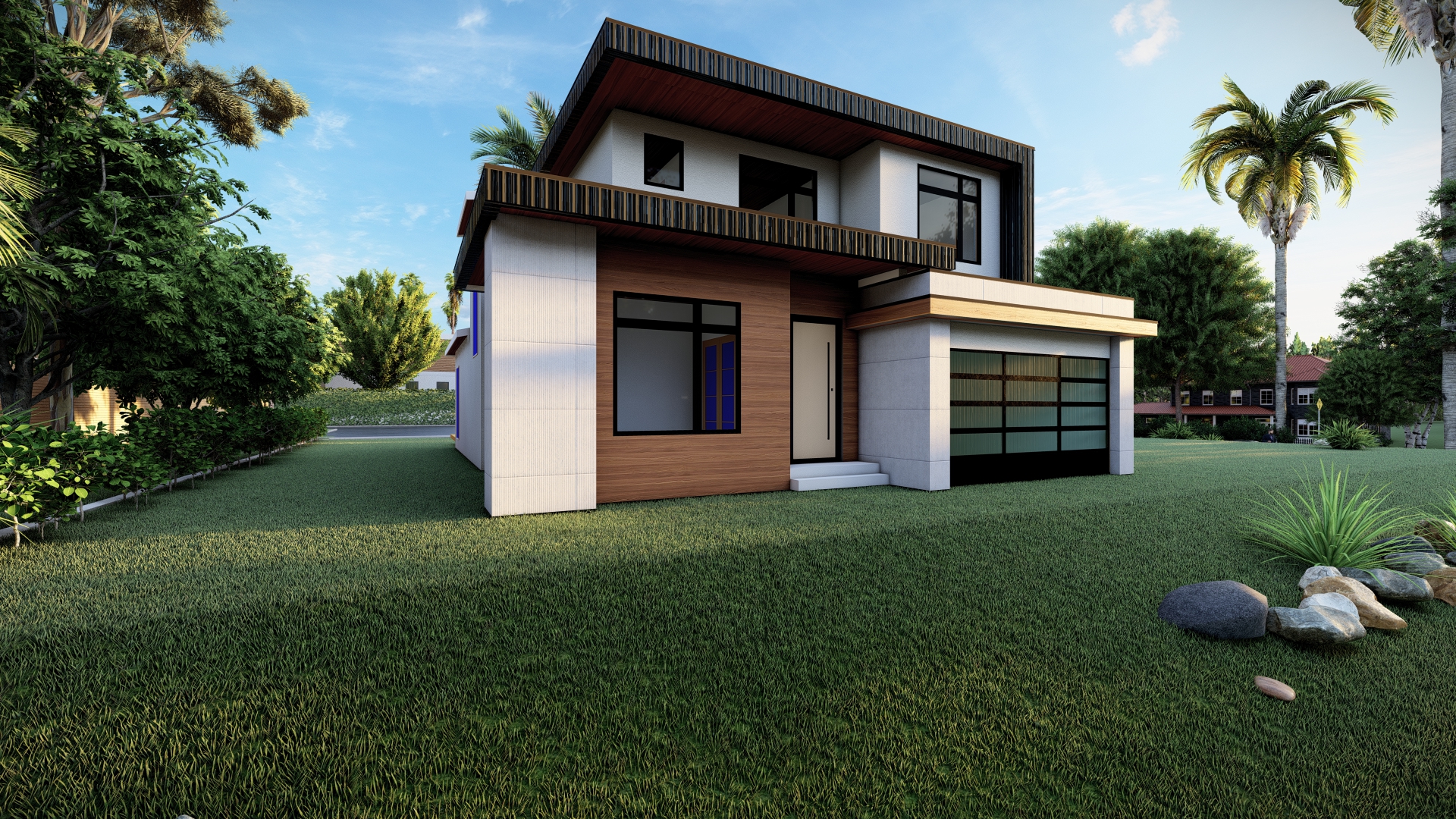 modernist exterior shot add landscape driveway and walkway make it with contemprory finish material architecture