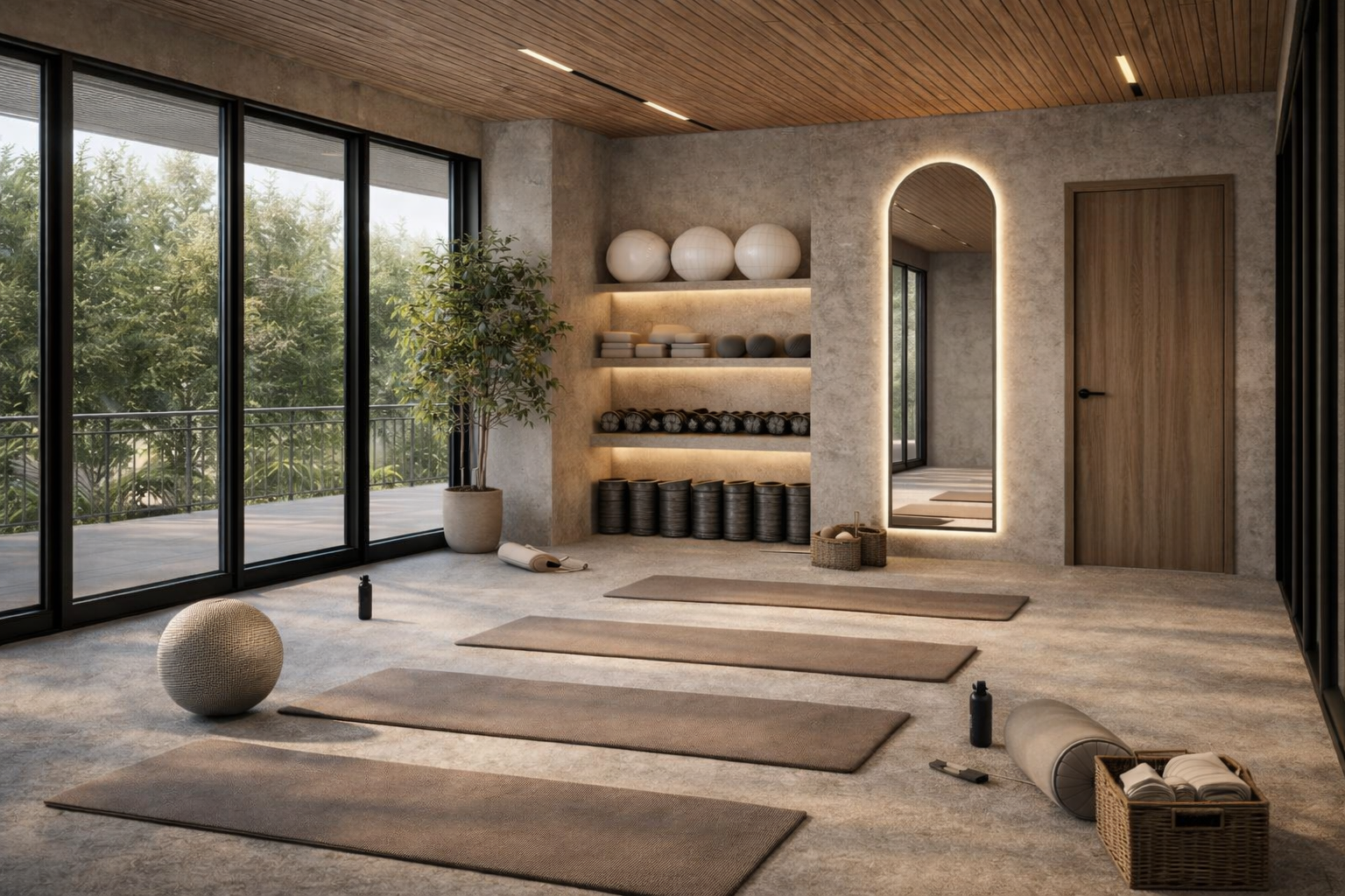 please lease everything the same unles i say otherwise remove the wood door and create a wall opening where it is curently remove the mirror and the shelfs make that back part of the wall flat have mirrors floor to ceiling on the back wall with a 85 tv centered change the ceiling to plane plaster and lighten the wall color remove the carpet and add wood flooring a walnut color with larger planks going horizontallly
