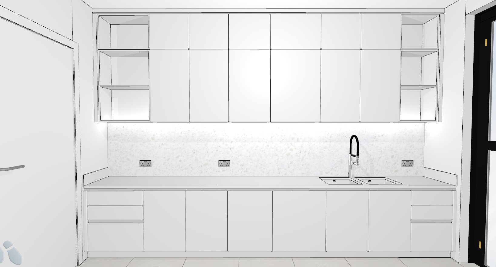 render a modern kitchen with a clean and minimalist design use a soft white for the cabinets and walls to create a bright and airy atmosphere the countertops should be a subtle white marble adding elegance the flooring should be light grey tile maintaining a harmonious flow include soft natural light streaming through the window enhancing the warm welcoming ambiance