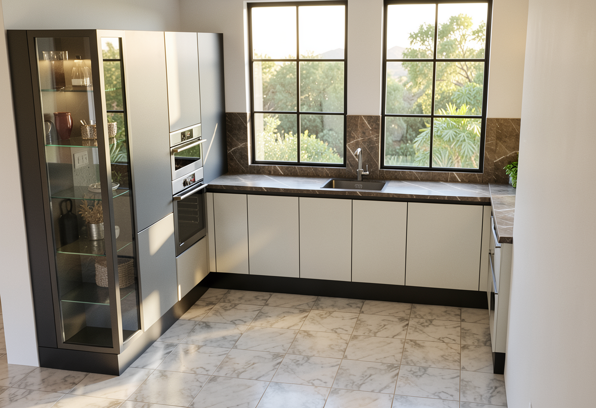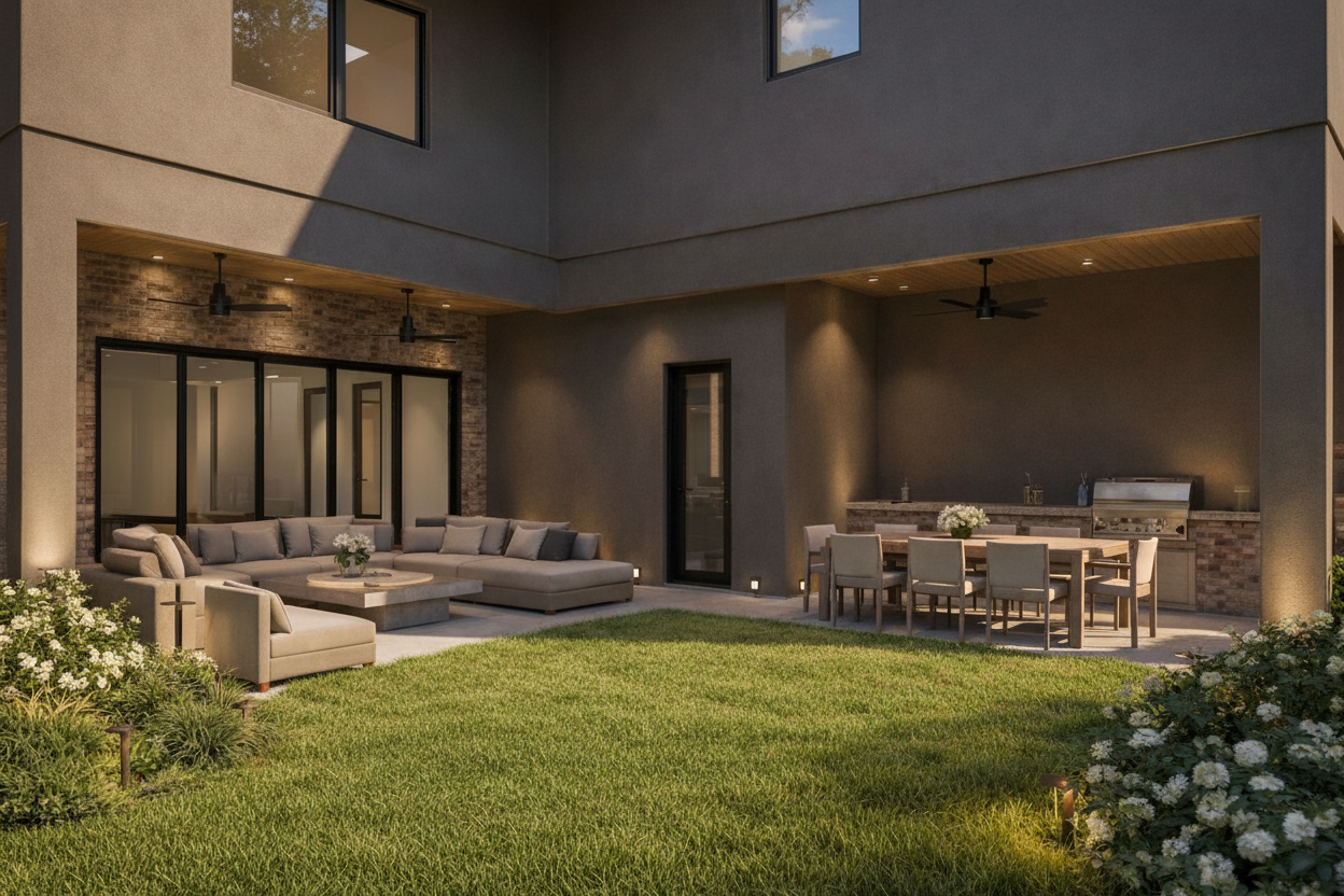 the final image should appear extremely photorealistic resembling a professional luxury real estate photograph rather than a rendering soft natural daylight this light should produce subtle highlights on surfaces natural shadow depth and realistic interior bounce light throughout the space lighting should feel soft balanced and editorial similar to high end architectural digest photography avoid harsh contrast artificial glow or overexposure materials should render with true to life texture and depth including realistic wood grain variation in the flooring accurate matte surface reflections and believable shadow transitions reflections highlights and shadows should behave naturally as they would in a professionally photographed interior surfaces should not appear glossy or artificial unless the material naturally requires it the overall image should feel calm refined and convincingly photographic as if captured by a professional architectural photographer using natural daylight