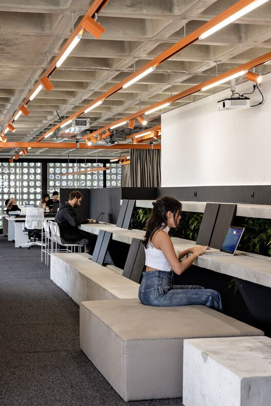 a modern office interior emphasizing an exposed waffle concrete slab ceiling deep coffered grid structure clearly visible fully exposed mechanical systems including hvac ducts vents and ceiling mounted ac units all in clean white suspended linear white light fixtures running parallel across the ceiling raw concrete textures contrasting with crisp white systems industrial minimalist aesthetic open plan workspace below with long communal desks neutral tones architectural photography style wide angle perspective ultra realistic sharp details balanced natural and artificial lighting 8k