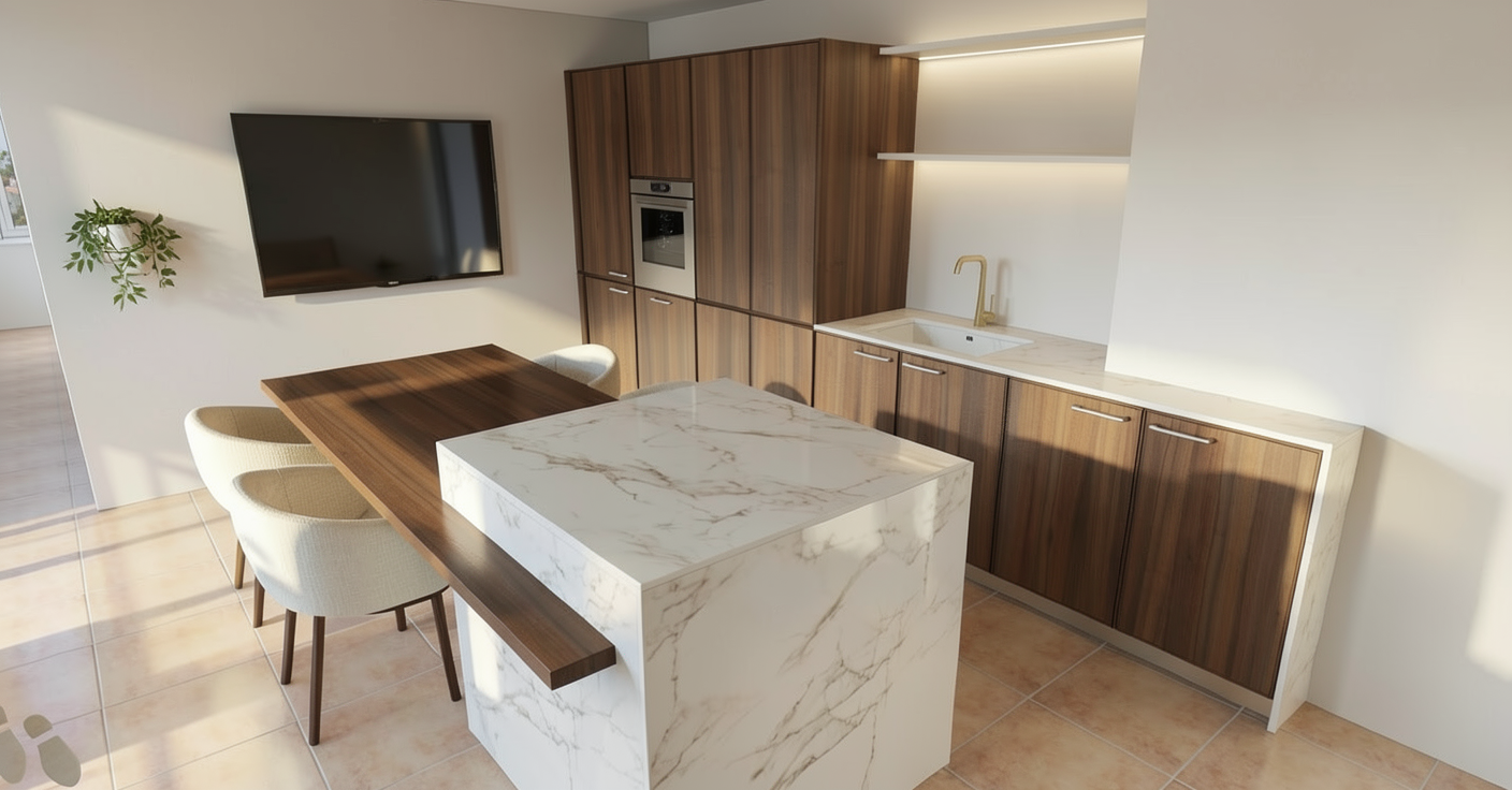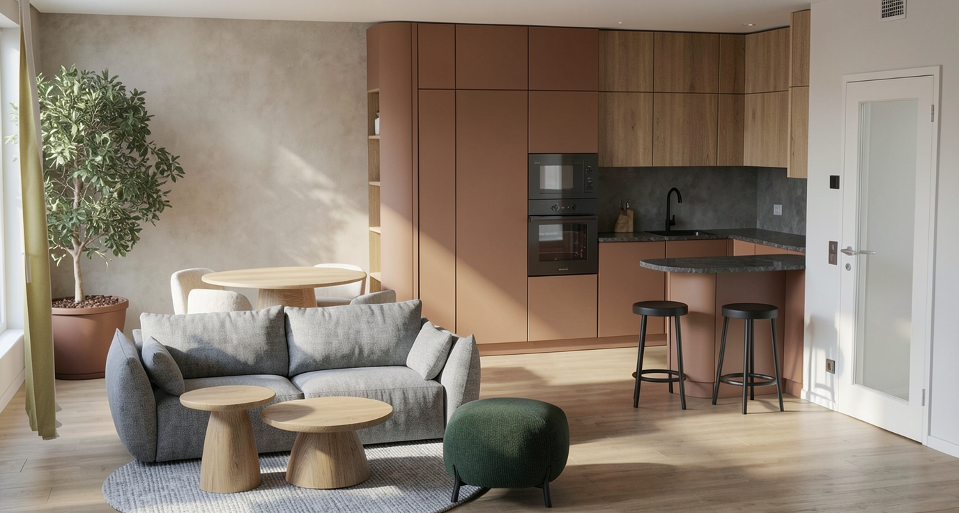 strong controlled prompt use the provided screenshot strictly as the base image for composition camera angle proportions furniture placement and architecture do not change the layout object positions furniture shapes or room geometry only improve materials lighting and realism convert the scene into a highly realistic interior render of a modern open plan living room and kitchen kitchen the lower kitchen cabinets have a warm cinnamon brown color with a matte finish the upper kitchen cabinets are natural oak wood with a soft subtle grain and the same tone as the wooden tables in the room the kitchen countertop is dark grey stone with a very subtle almost uniform texture and minimal veining instead of a backsplash the wall behind the kitchen counter is finished with a warm toned cement plaster concrete microcement surface with a soft natural texture walls the wall behind the dining table has the same warm cement plaster finish as the wall behind the kitchen countertop the finish should have a warm beige grey cement tone natural variation and a smooth hand applied texture wood elements the following elements are natural oak wood with a consistent tone coffee tables in the living area dining table behind the sofa upper kitchen cabinets shelving niche on the right side of the tall kitchen cabinet the oak should have soft subtle grain with a calm natural appearance furniture bar stools are black wood with a matte finish coffee tables are solid oak wood dining table is oak wood in the same tone as the coffee tables dining chairs around the dining table are upholstered in white boucl fabric with a pronounced textured surface the chair legs have the same cinnamon brown color as the kitchen cabinetry textiles the rug is light grey with a pronounced woven textile structure the sofa is upholstered in fabric slightly darker grey than the rug the round ottoman in the foreground is upholstered in dark green fabric lighting natural daylight enters from the left side of the room producing soft realistic shadows and balanced interior illumination style calm modern interior scandinavian inspired design natural materials warm tones soft textures photorealistic rendering quality global illumination high detail materials important constraints do not modify camera position furniture placement object proportions room layout architectural elements only enhance materials textures lighting and realism