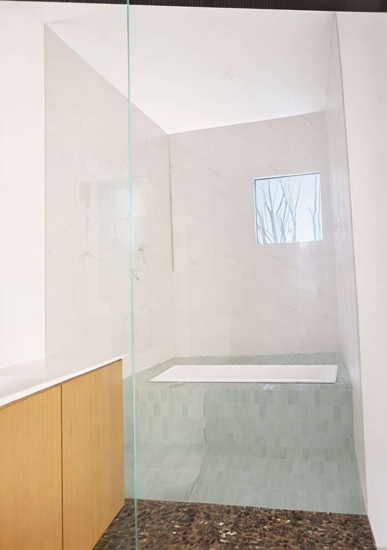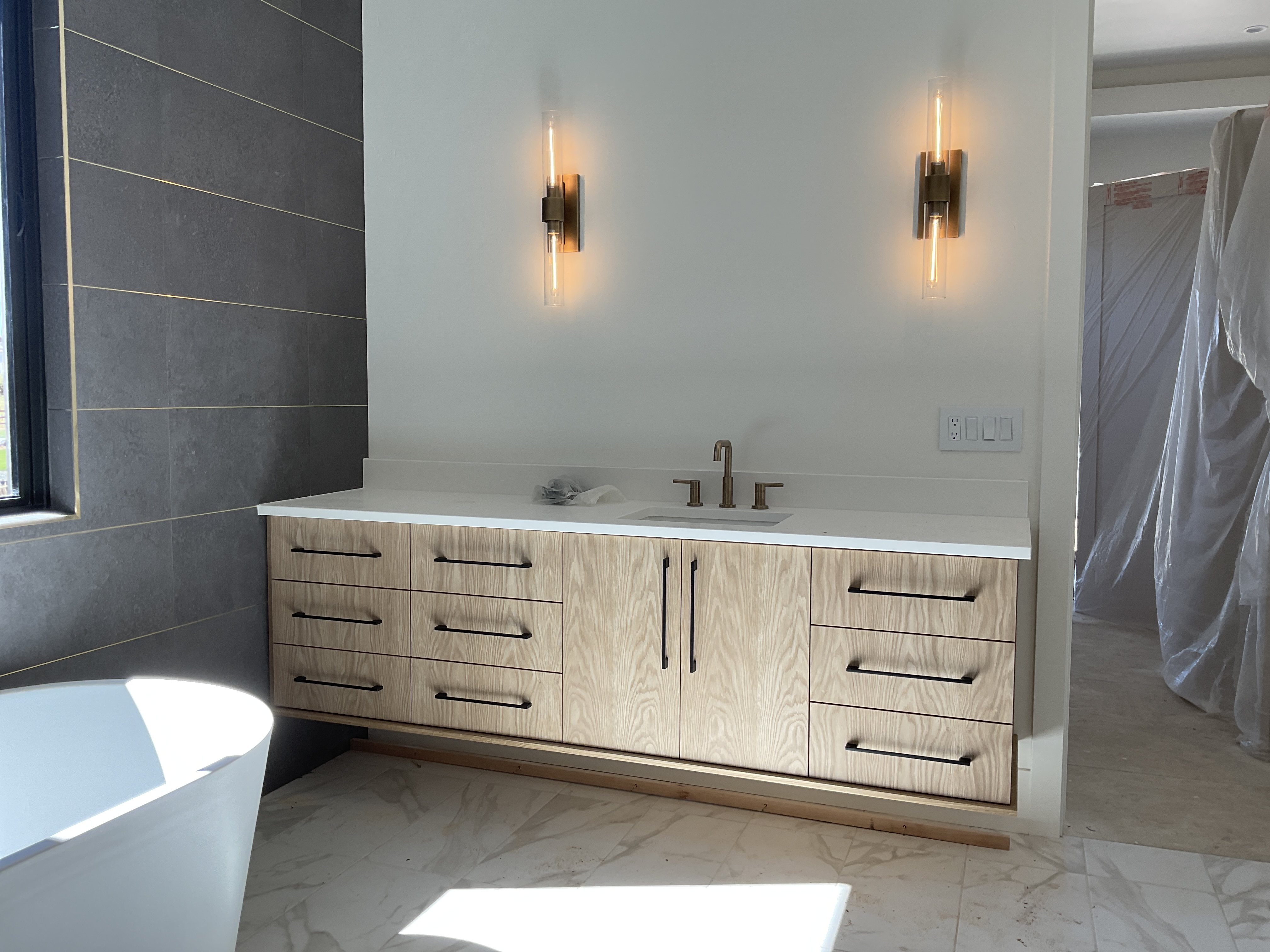 remove the piece of wood from under the vanity add a mirror style the vanity top remove the white sheeting on the right side doorway
