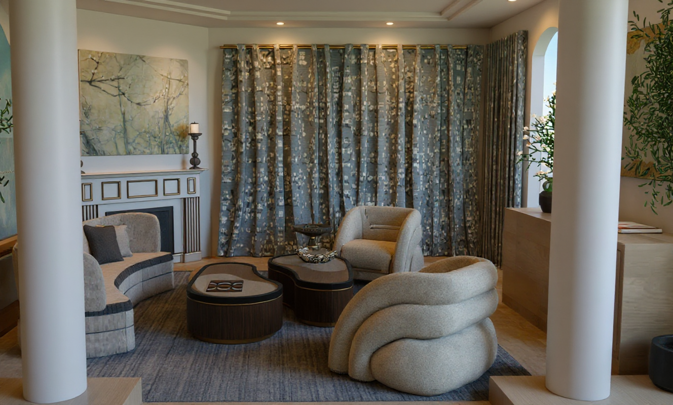 make photorealistic add recessed ceiling lights make brighter add detail to cabinet make curtain rod bronze and fireplace white make sofa more refined and real looking