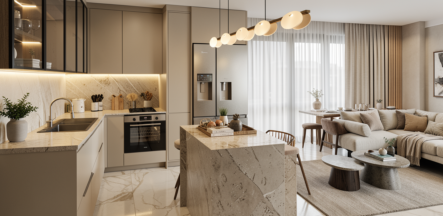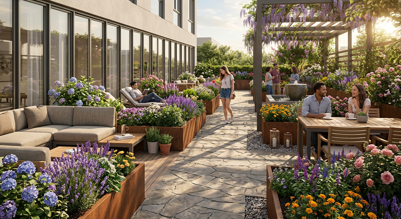 a small elevated porch with red brick columns and chimney wooden railings and pale beige concrete pillars the roof is a warm earthy brown with a slight reddish tint the stairs are made of smooth concrete the house exterior is pristine white the ground is covered in lush green grass the atmosphere is bright and serene under a clear blue sky with soft natural daylight casting gentle shadows