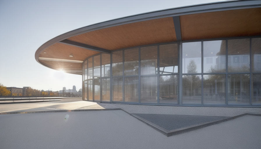 modern exterior shot bus station steel construction wooden roof accents horizontale massivholzdecke glas facade with sliding doors concrete floor located in the city buildings in the background city skyline architecture