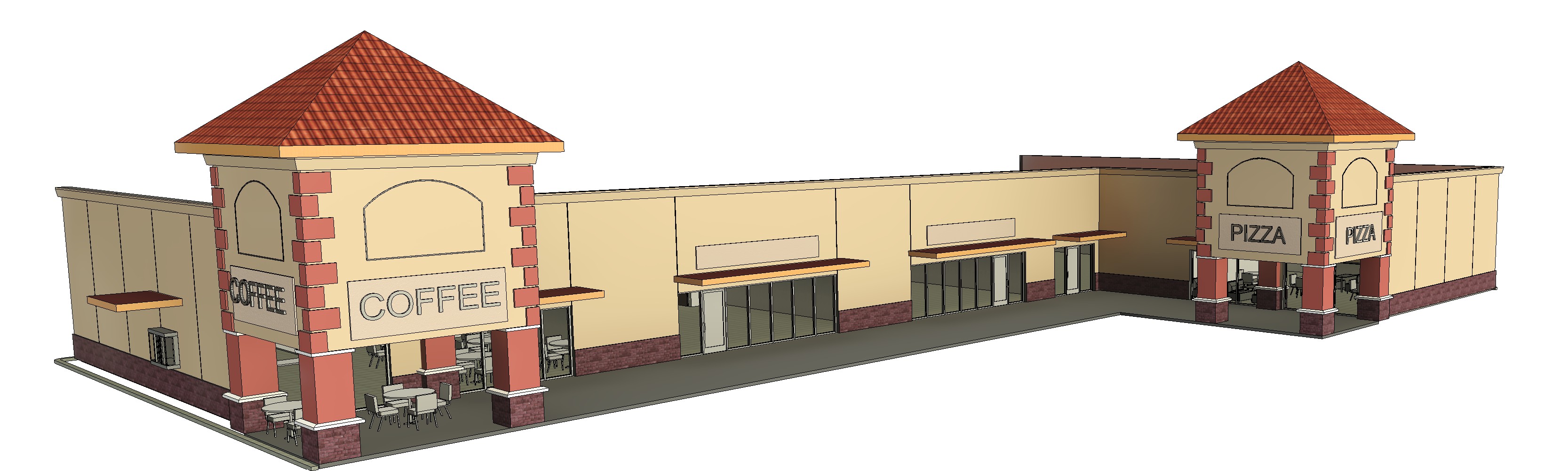 realistic rendering with people and cars parked in front facing the long area spanish tile tower roofs signage at the stores of various types some rould planters with flowers along the walks light shadows to show depth the arched elements on the towers are slightly recessed blue skies with clouds tops of trees in the distance paved parking show a car at the driveup window at the end parallel to the window and facing the tower
