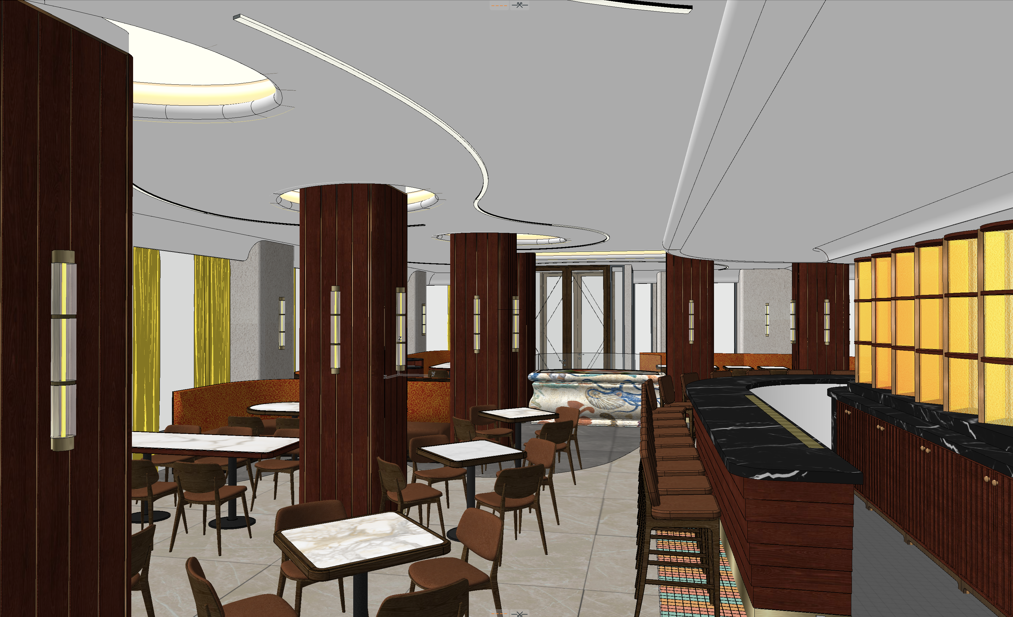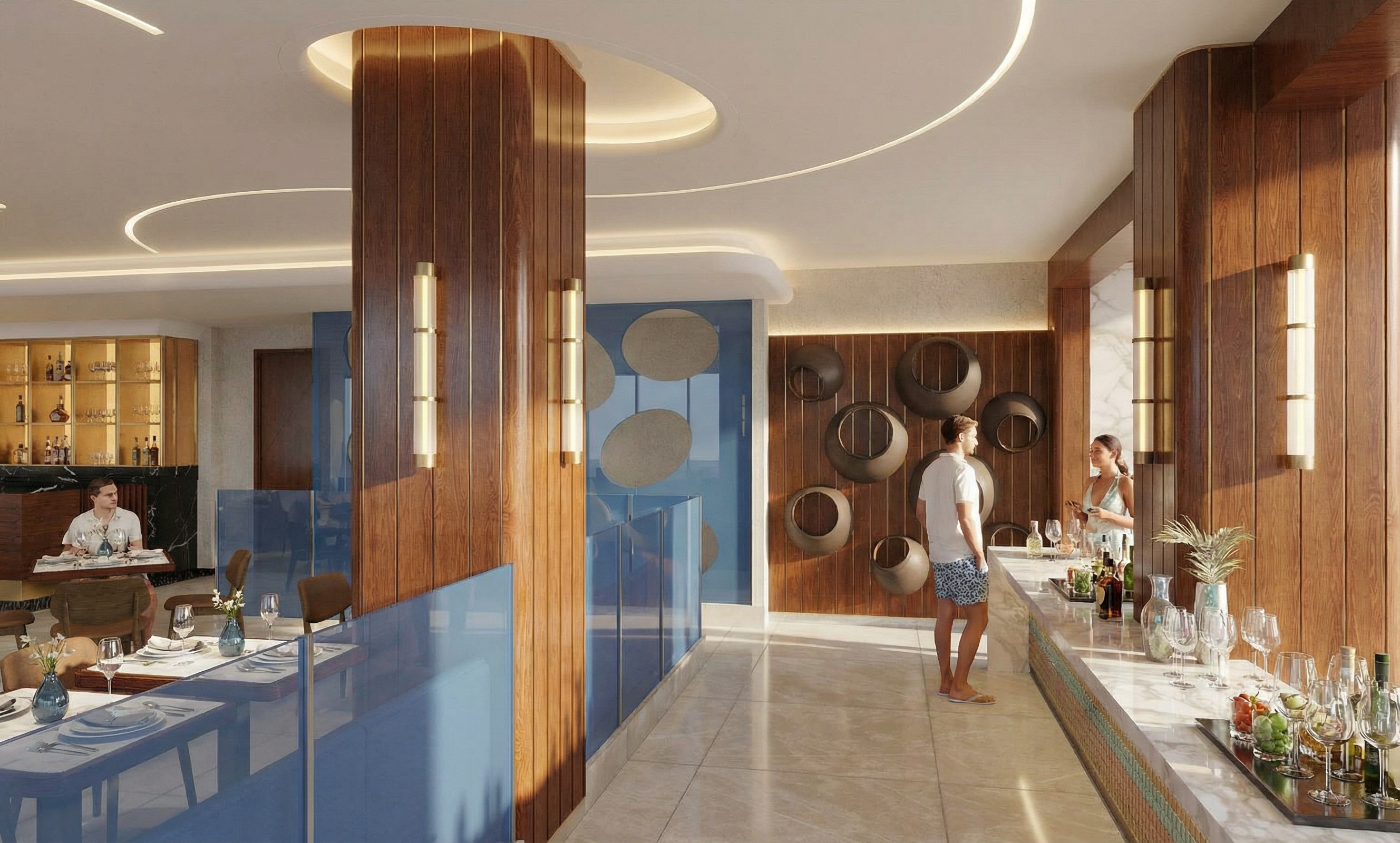 transform the provided restaurant interior image into a high end photorealistic daytime render with bright lighting subtle reflections and highlights while keeping everything exactly the same same proportions same seating layout same bar configuration same ceiling curves same wall finishes same materials same colors and same spatial arrangement do not change or move any objects geometry patterns or composition add premium table settings on selected dining tables including cloth napkins elegant plates cutlery glassware and small decorative vases without altering table or chair placement enhance the bar area with refined d cor elements such as cocktail glassware bottles garnish pieces and polished presentation details include a mix of 2 3 people positioned only at the bar and at dining tables with varied but cohesive upscale resort appearance relaxed natural well integrated correctly scaled and not blocking design visibility lighting should feature bright daylight combined with reflected highlights and subtle shimmering accents giving a vivid polished luxurious catalog feel enhance realism with wood grain depth marble surface reflections brass sheen textile richness soft shadows and crisp clarity while keeping the entire interior design exactly as originally shown