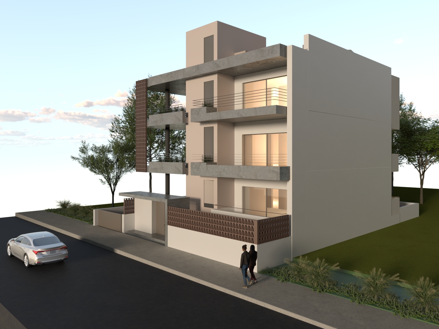 render a hyper photorealistic 3d perspective of this house located in nafplio greece keep the exact same model geometry without changing the architecture including the windows doors roof walls garage door pavement and driveway enhance the existing materials so they appear more realistic and high quality with natural textures and realistic glass reflections improve the surrounding landscape with lush mediterranean vegetation appropriate to the nafplio region such as olive trees mediterranean shrubs aromatic plants and natural planting use clear mediterranean daylight with a bright blue sky and subtle atmospheric depth lighting should feel natural and balanced creating realistic shadows and depth in the scene maintain the same camera view and composition while only improving materials lighting and landscaping render in ultra realistic architectural visualization quality cinematic lighting highly detailed textures professional architectural photography style hyper realistic rendering 8k resolution