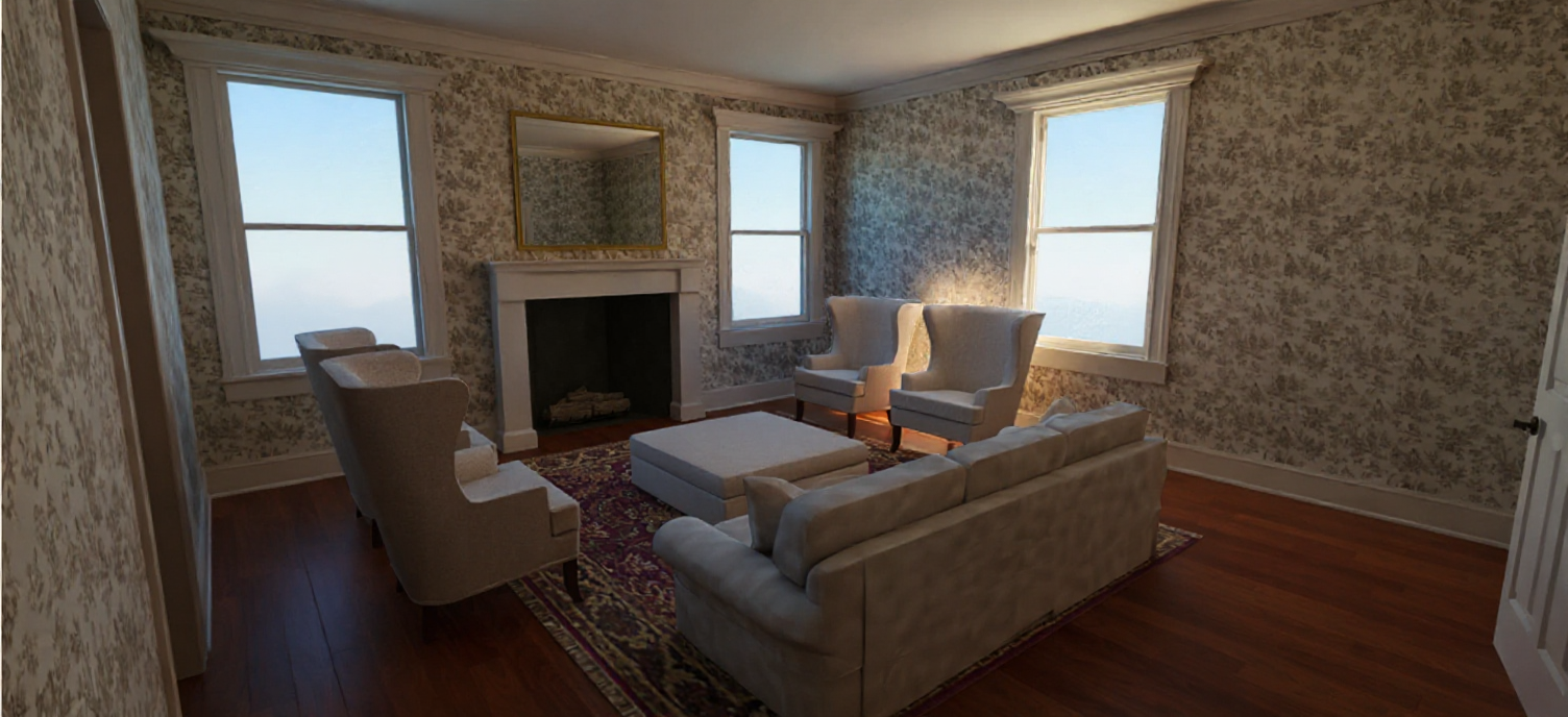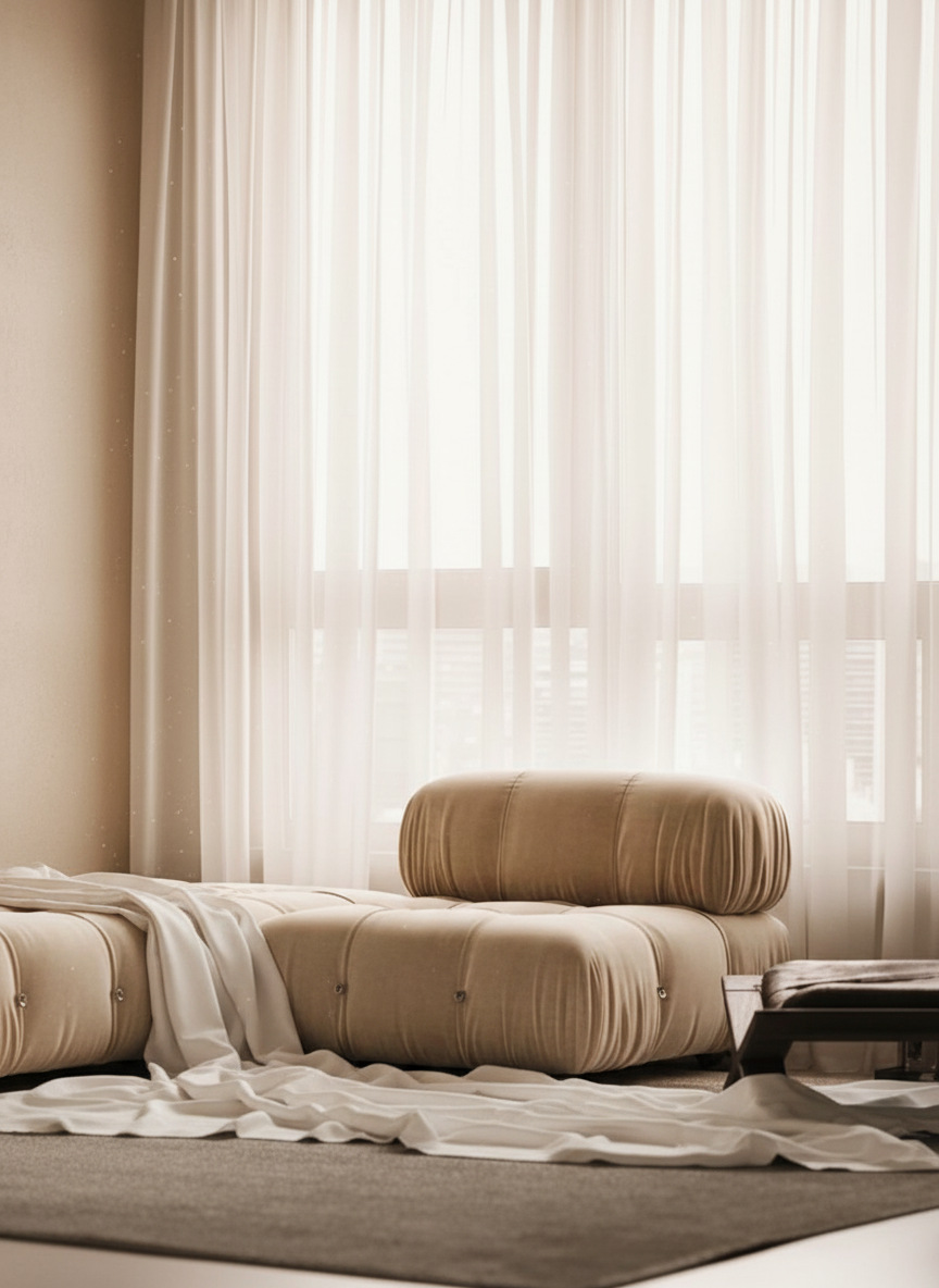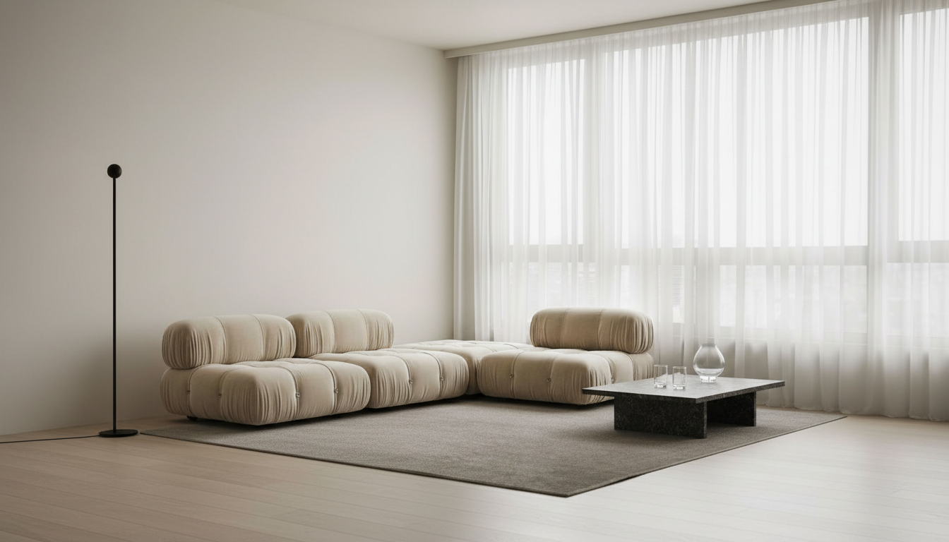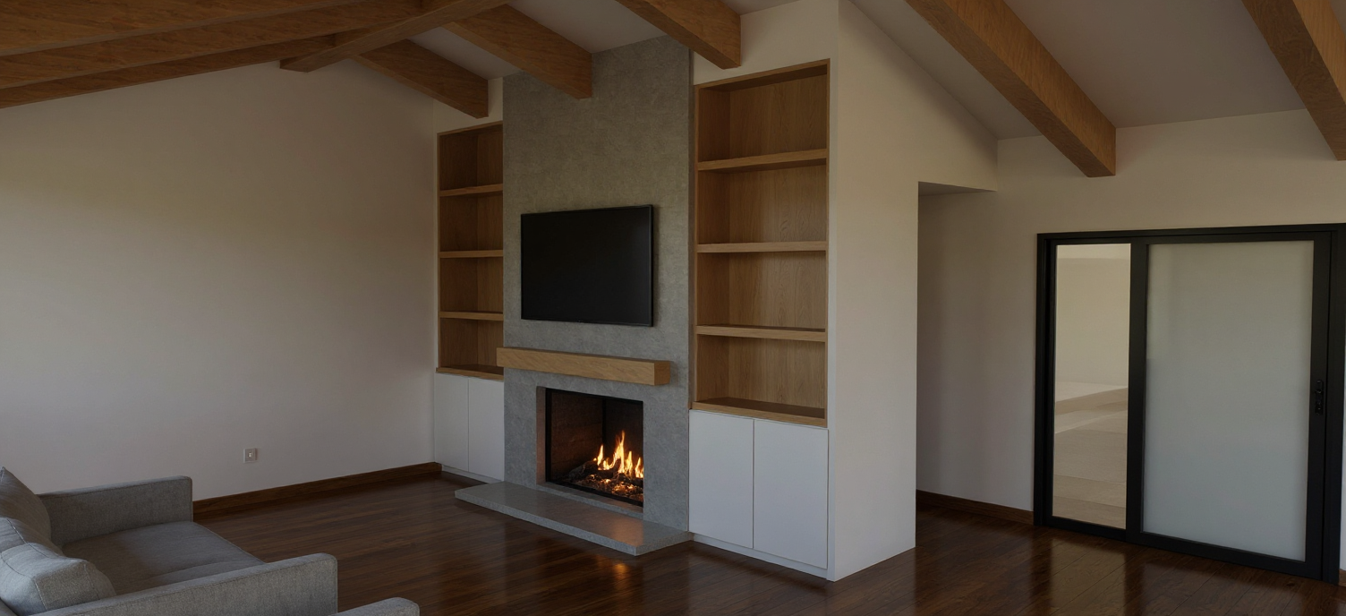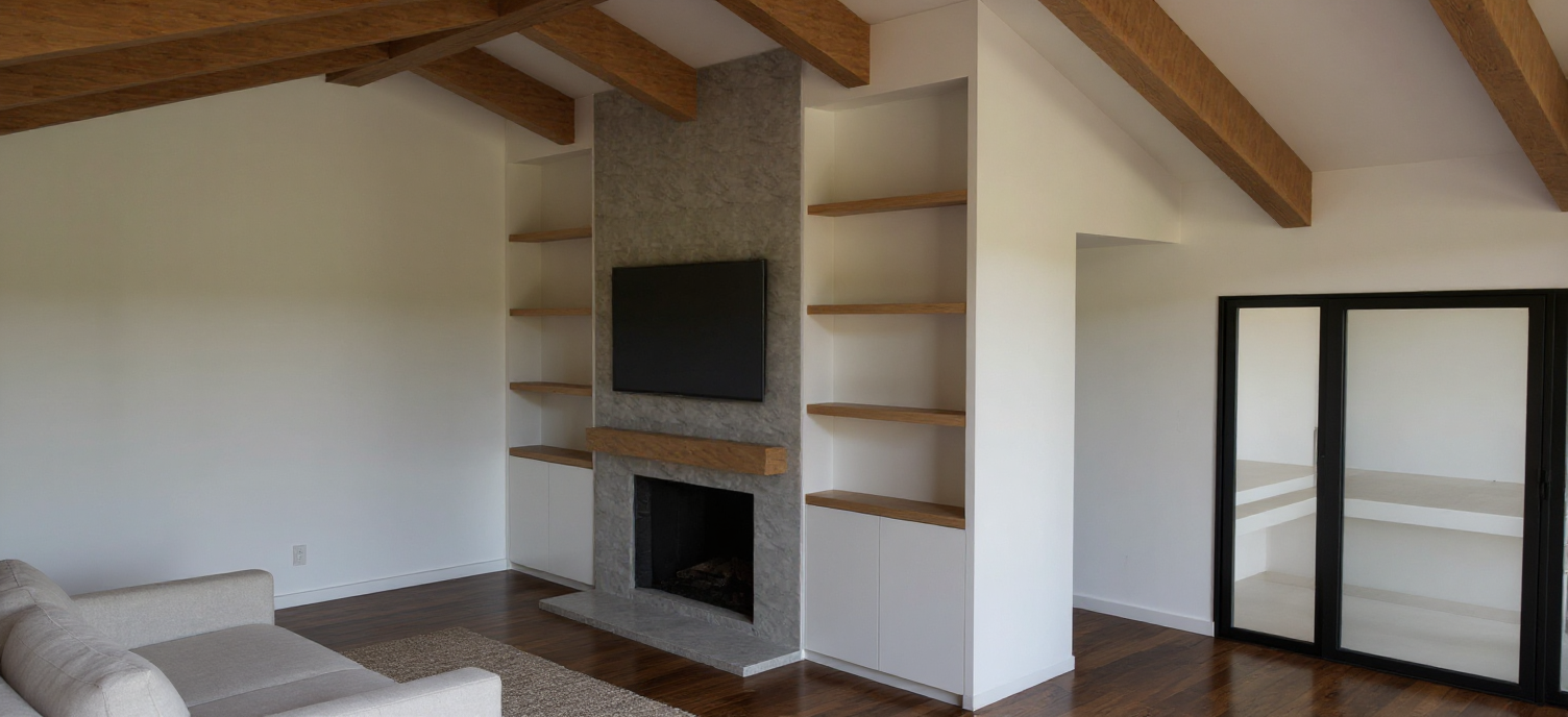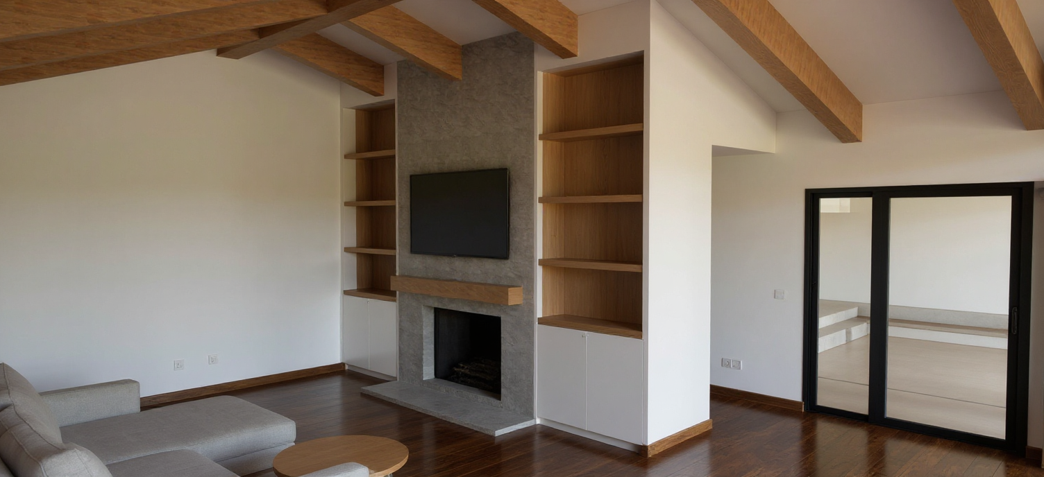 render a modern living room with a cozy warm atmosphere use light oak for the wooden beams and shelves the walls should be a crisp white contrasting with a textured light gray for the fireplace wall the television is mounted above the fireplace with a subtle black frame include a light oak mantelpiece the floor is a rich dark walnut wood the sliding door has a sleek black frame soft ambient lighting creates a welcoming feel prioritize natural material textures and subtle harmonious color contrasts shelving to be white add fire to fireplace add soft lighting add crystals and decorations to shelving
