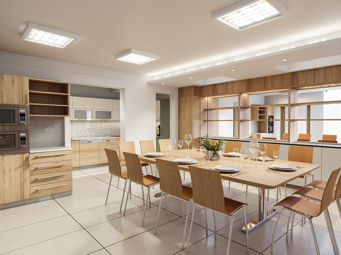 hyperrealistic editorial interior rendering of a contemporary kitchen dining space maintaining the exact composition camera angle and lighting of the reference image soft natural daylight enters from the right side window filtered through a semi opaque white linen blind creating a calm diffused ambient light with gentle shadows the overall atmosphere is natural slightly muted and visually balanced floor made of large format rectified porcelain tiles approx 120x120 cm with a microcement finish very minimal joints almost imperceptible matte surface with subtle texture kitchen cabinetry in natural walnut wood with vertical grain warm tone smooth matte finish upper cabinets are finished in a very light grey almost white matching the wall and floating shelf countertop and backsplash made of marble effect porcelain matte finish with slight roughness soft veining not glossy brushed stainless steel faucet on the left wall a floating shelf in the same light grey tone as the wall on top of it three square frames with thin black borders aligned horizontally exactly as in the reference image on the countertop corner two tall white porcelain containers and one white porcelain utensil holder containing wooden kitchen tools next to them two wooden cutting boards placed vertically leaning against the backsplash beside the boards a compact nespresso coffee machine in grey and black dining area round table with brushed stainless steel structure chairs with brushed stainless steel legs and upholstered seats in dark grey fabric on the table a cylindrical transparent glass fruit bowl containing pears pendant lamp above the table made of papier m ch carton piedra organic soft shape similar to zara home style matte and slightly textured surface overall materiality is realistic with subtle imperfections and tactile surfaces no plastic appearance maintain exact proportions layout and object placement from the reference image no added or removed elements depth of field very subtle mostly sharp image with slight natural softness for an editorial photography feel