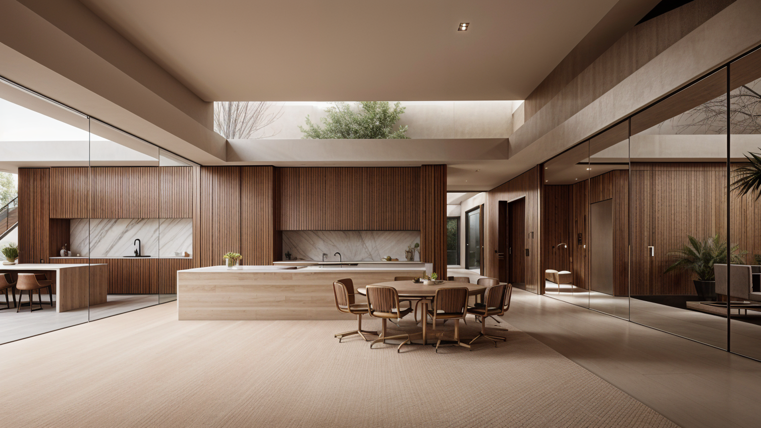 render a realistic 3d floor plan of a luxurious rooftop penthouse from a top down perspective the view should clearly show all rooms furniture and finishes with accurate proportions and realistic material shading use high quality materials matte wood flooring calacatta marble surfaces and warm lighting accents to convey a sense of sophistication and depth surrounding context should include the adjacent existing buildings on the left and right sides shown as clean minimal white massing blocks to represent their presence without detail the penthouse itself should stand out with realistic shadows subtle reflections and natural daylight illumination to enhance architectural realism and contrast against the simplified white blocks of neighboring structures
