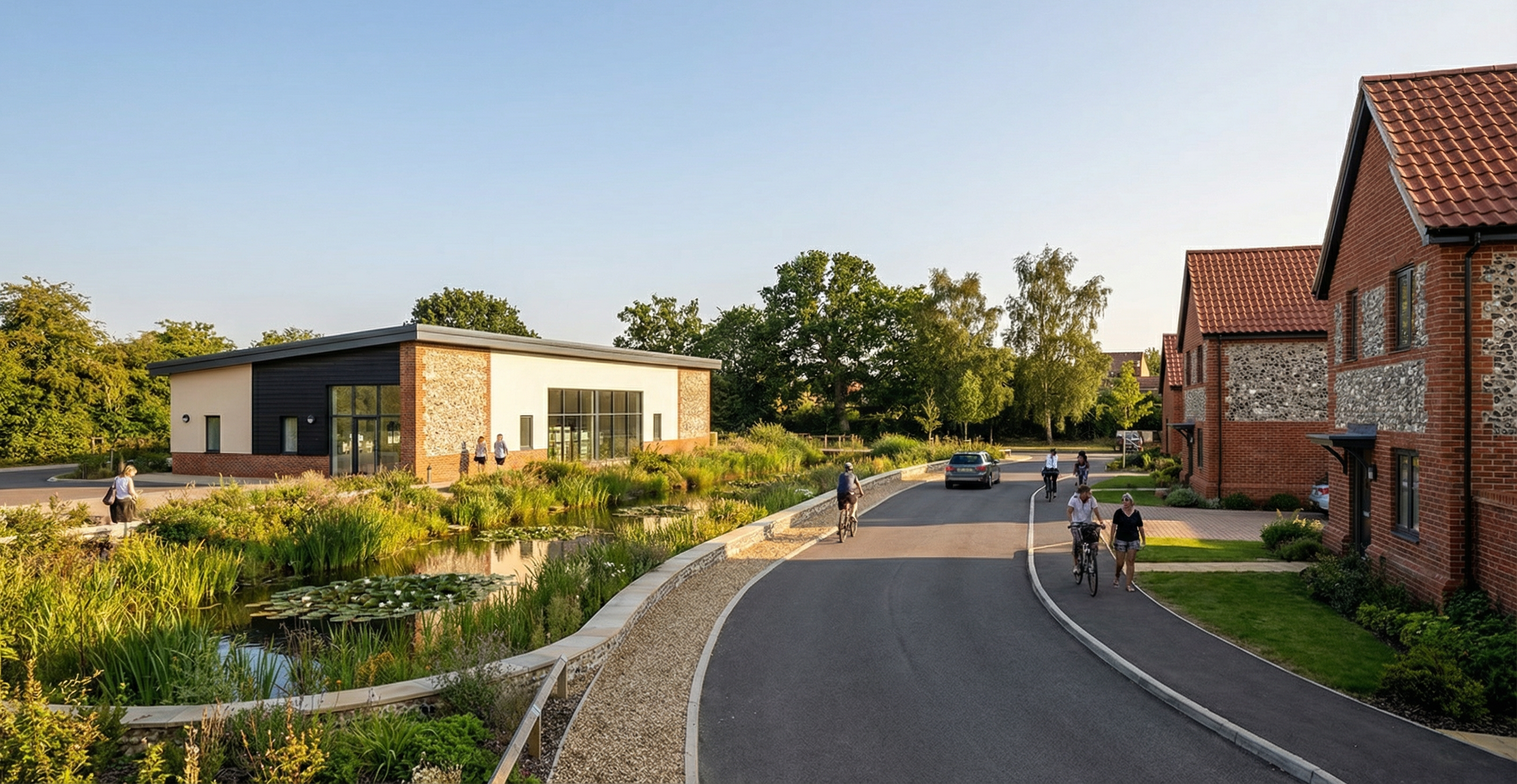 frank lloyd wright inspired design with warm grey green earthy siding with limestone stonework black garage doors and windows with charcoal asphalt shingles acreage site with prairie grasses and trees in the distance warm soft shadowing in summer time make angle on the house more straight on then angled