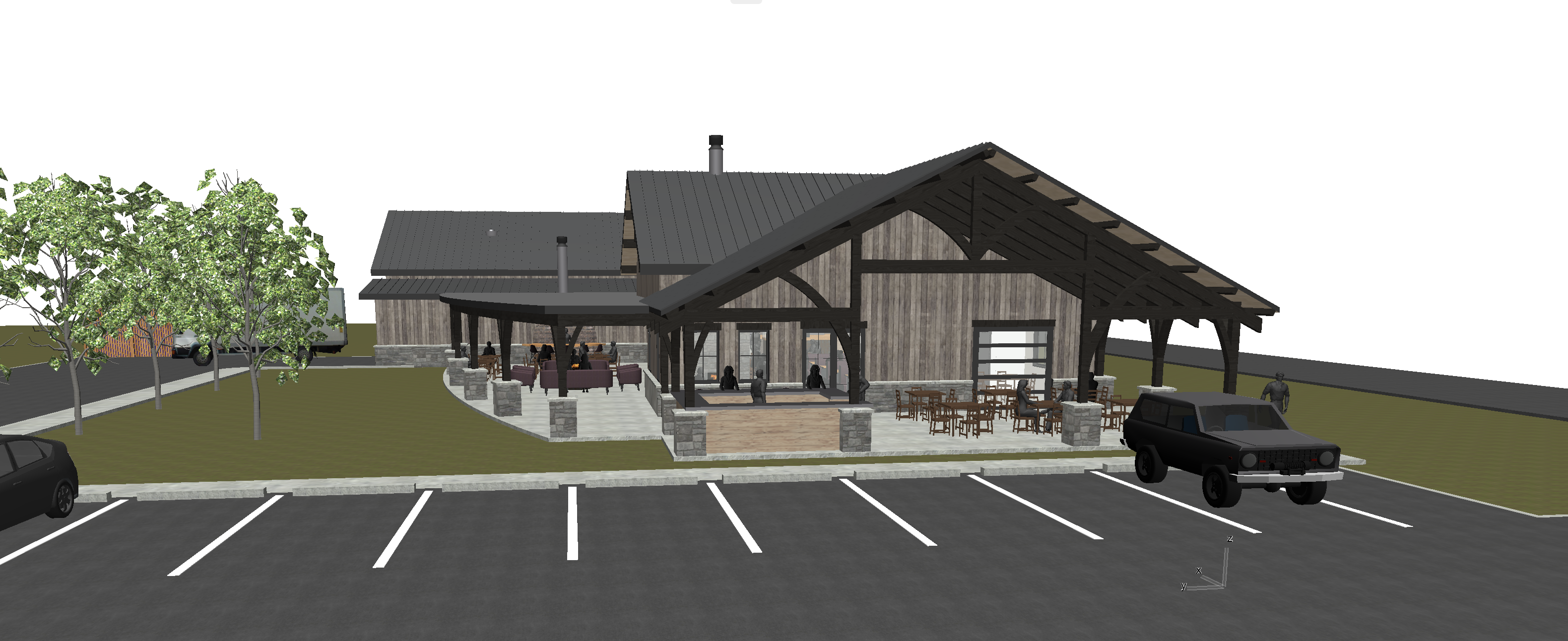 grainy watercolor render of timber frame building with wood siding and stone wainscot watercolor trees and urban environment in the background road along the right side of the building architecture