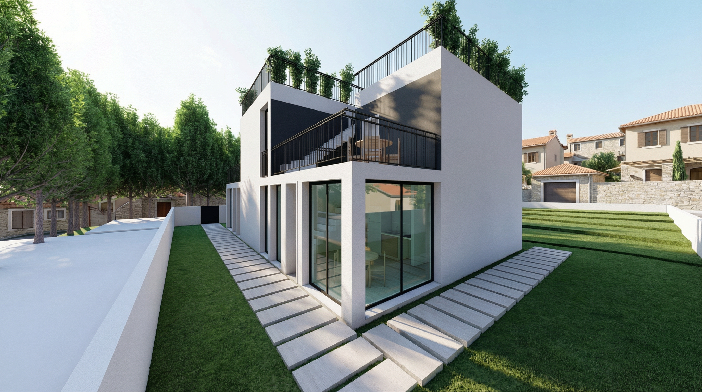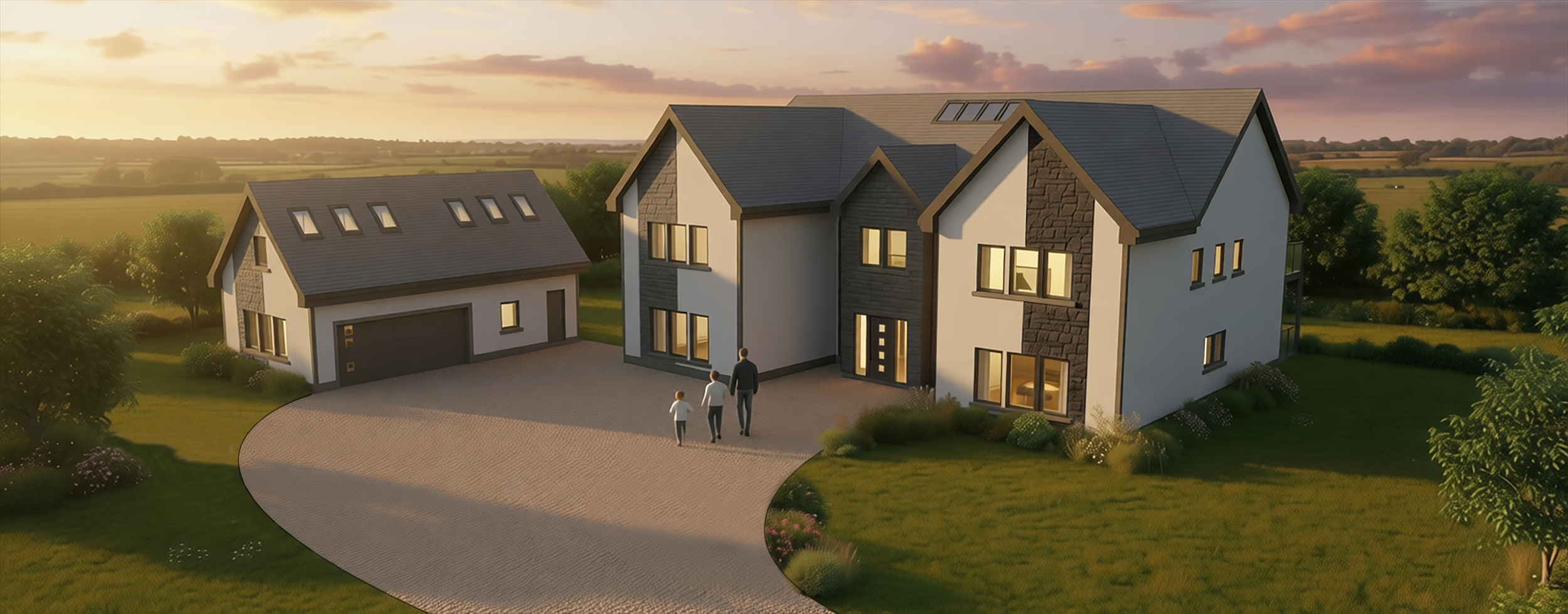 refine and enhance the uploaded image while preserving the original design proportions and composition do not redesign or alter the building geometry focus on improving detail clarity and realism rather than changing the scene soft summer evening atmosphere just before sunset with gentle warm light subtle golden tones and a calm natural mood soft directional sunlight with realistic falloff and long delicate shadows high quality photorealistic materials and textures with physically accurate lighting global illumination and natural reflections enhance surface detail and material response while keeping everything believable and true to life realistic sky with soft color gradients and mild atmospheric depth no dramatic or stylized clouds landscape and surroundings refined naturally for realism restrained planting believable grass texture and color and subtle environmental detail avoiding exaggeration or stylization ultra high quality natural photographic output clean realistic and timeless no stylization no artistic interpretation no illustration the final result should look like a high end real photograph captured on a warm summer evening