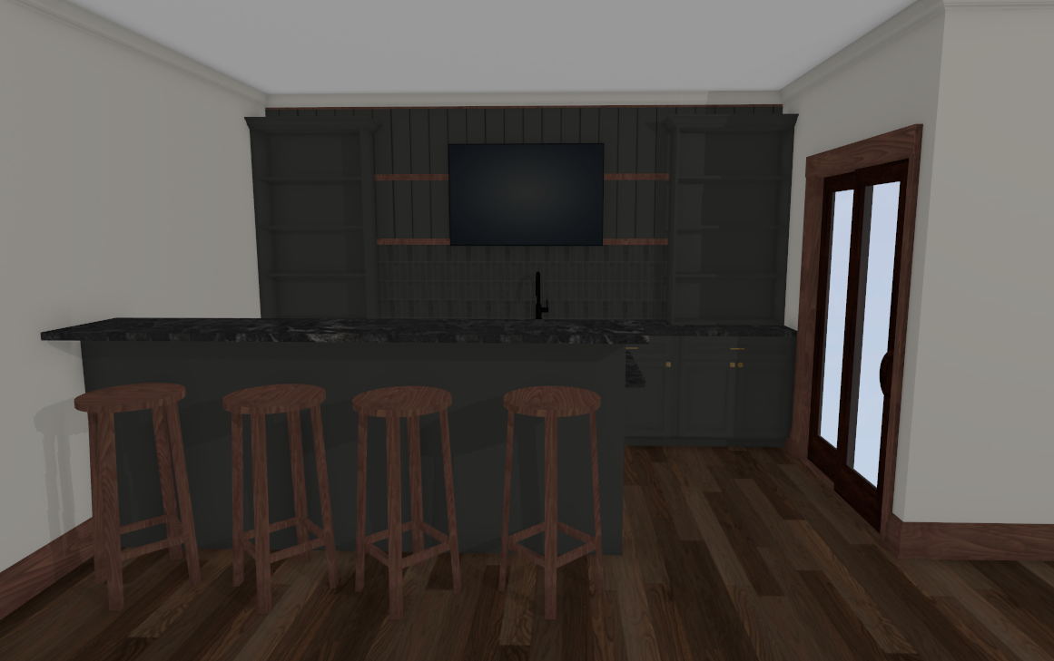 decorate shelves and cabinets transform this architectural interior design drawing into a photorealistic rendering maintain the exact layout dimensions and placement of all elements do not change materials colors or geometry additionally apply a very subtle hand drawn architectural sketch overlay faint pencil line edges around furniture silhouettes cabinetry and key architectural elements as if barely sketched over the photograph keep it extremely subtle the photorealistic image must remain fully dominant