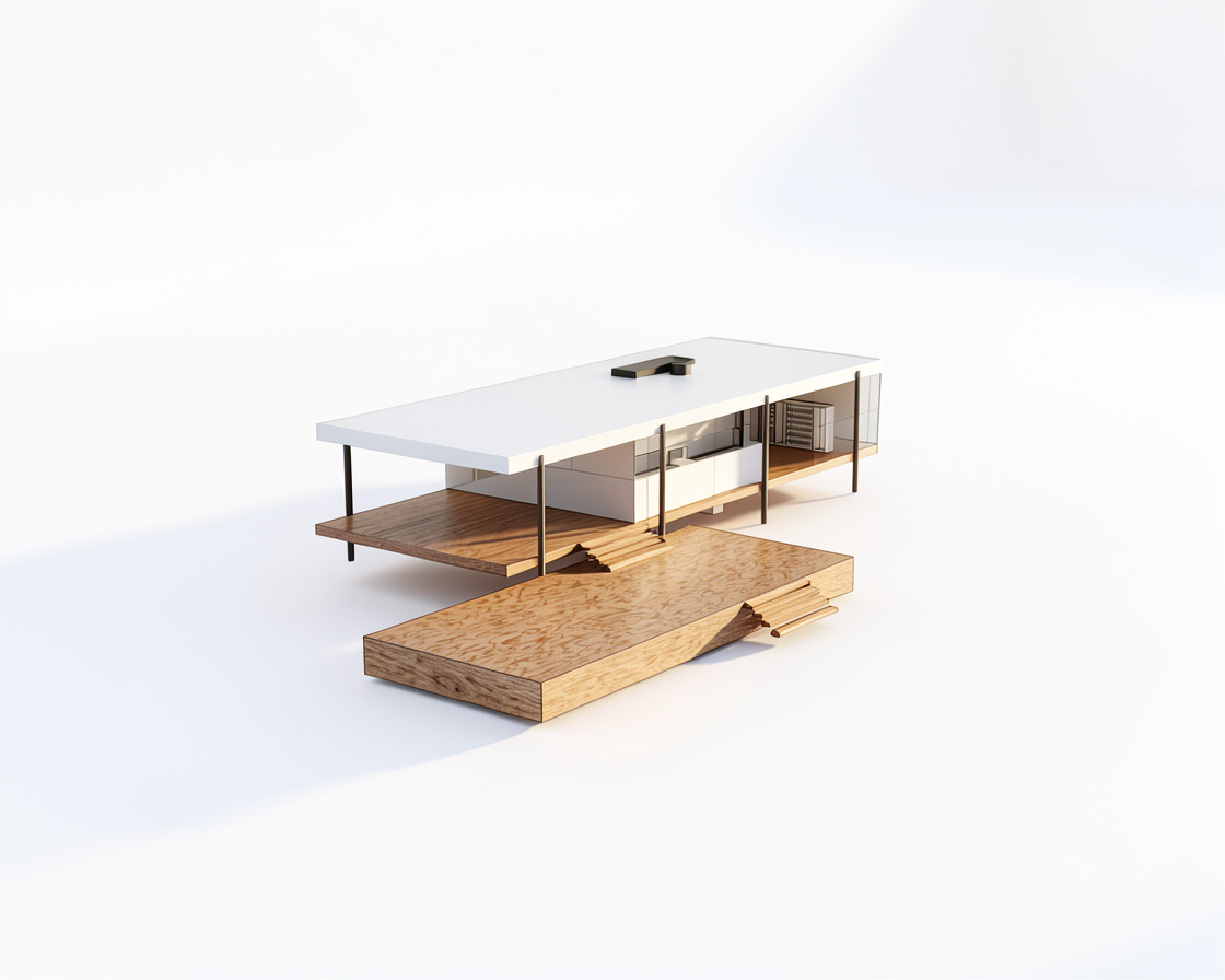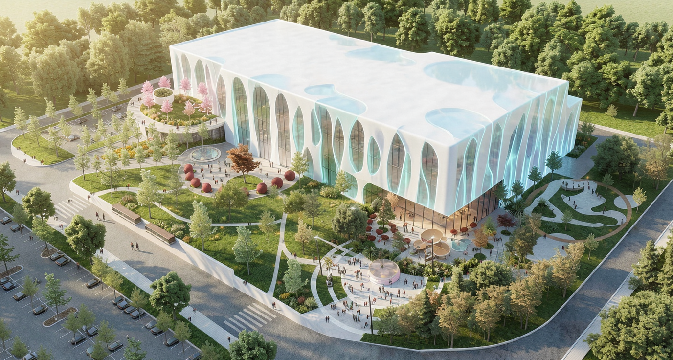 retain everything about the image just update the facade and roof generate a computationally designed architectural facade system composed of modular panels driven by a continuous wave algorithm the design should wrap seamlessly across all building surfaces including vertical facades and roof forming a single uninterrupted fluid skin the pattern is generated using parametric sine wave deformation fields mapped onto the building envelope the wave intensity varies based on curvature orientation and solar exposure creating dynamic modulation of depth rotation and scale of panels each panel is a slightly twisted geometric module glass or lightweight composite responding to the underlying wave field the panels should gradually transition in orientation producing a smooth flowing surface rather than discrete segmentation the facade should behave like a digital fabric stretched over the building with computational logic controlling wave amplitude height variation across facade wave frequency density of undulation phase shift across roof to wall transitions adaptive panel tilting responding to curvature materiality reflective translucent glass or etfe like membrane with subtle gradient transparency the roof is not separate but an extension of the same wave field allowing the facade to fold upward and continue as a continuous computational surface