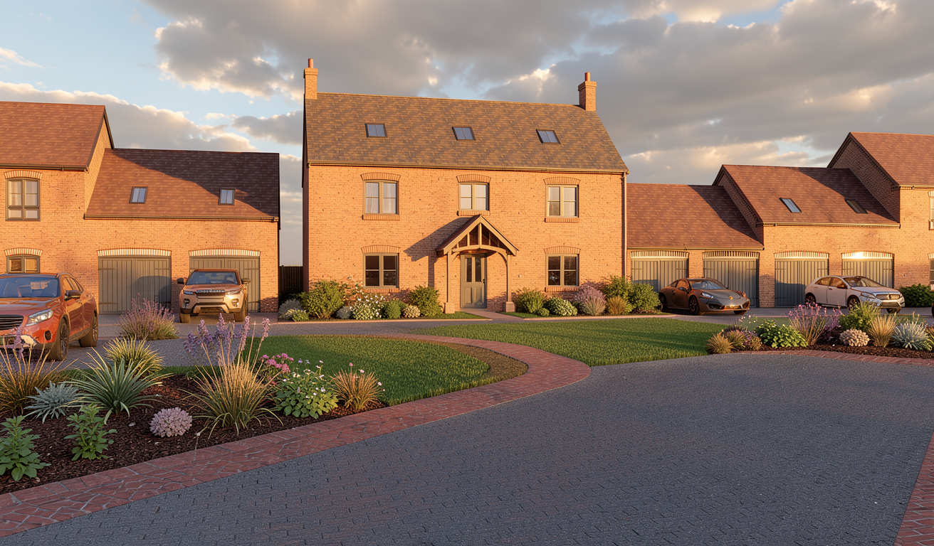 add trees and small bushes and flowers on the ground level add potted plants and trees along the rooftop railing on the left half of the roof