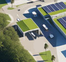 canopy structure weighing station with green roof on top four lanes of traffic with middle medium dividing lanes into 2 and 2 trucks coming out and in to station