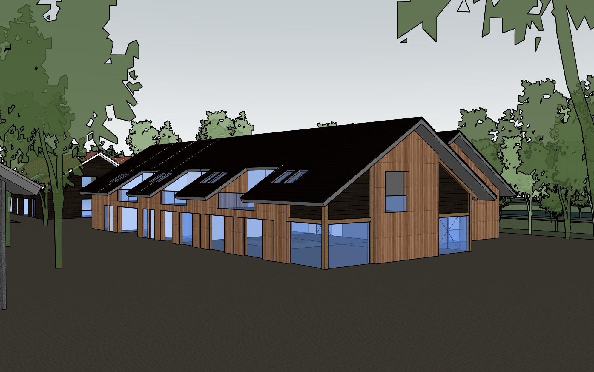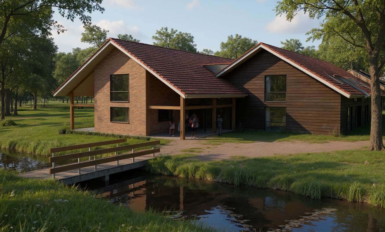 the house in the scene is surrounded by a lush green garden with lots of flowers and bushes there are lots of people in the scene the weather is sunny with a few clouds in the sky the time of day is noon sun on the facade maintain colors