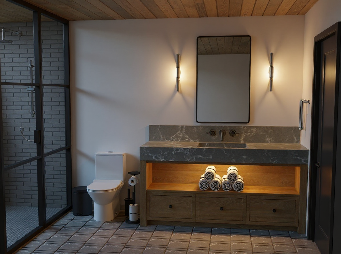 add grey stone floor add ambient lighting to create a warm and cozy feel add overhead bright lighting to add overall brightness to the space add daytime light add light in the shower wood shiplap ceiling add white walls