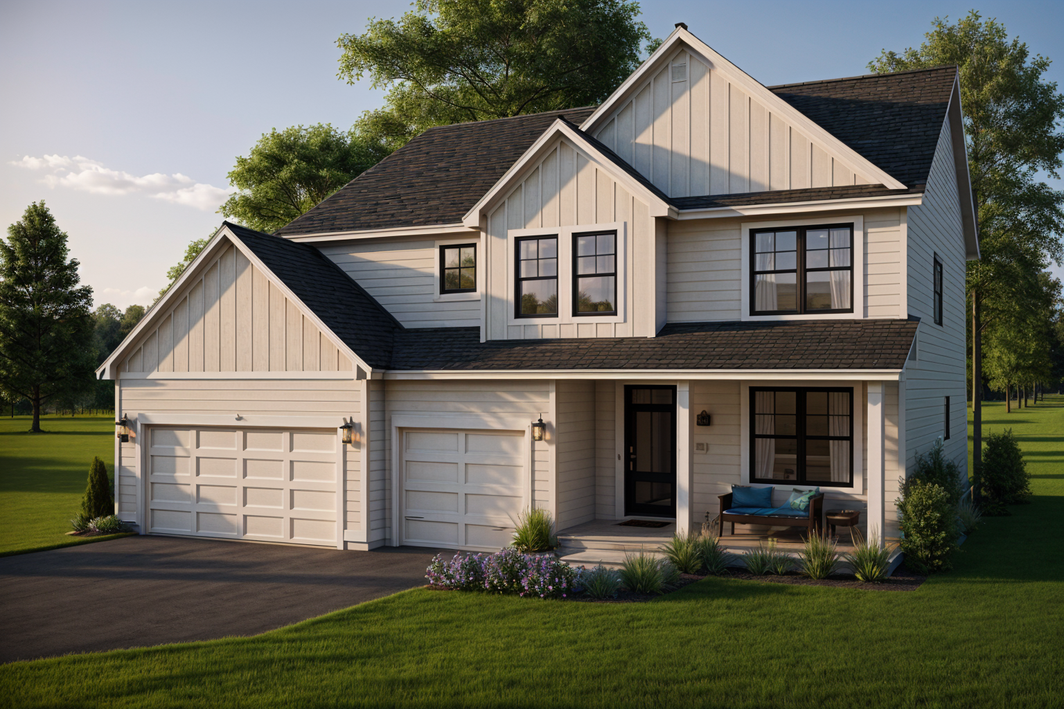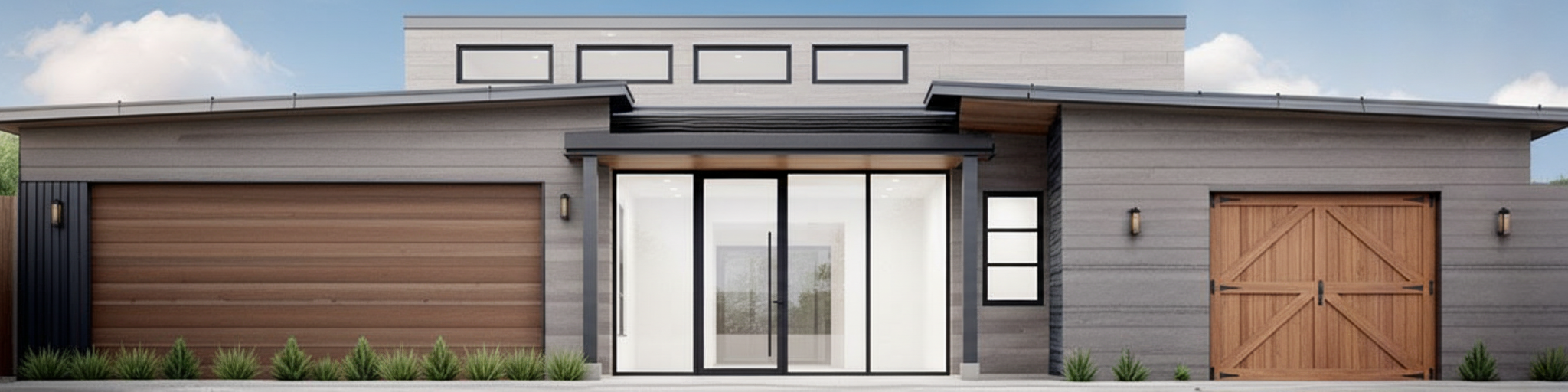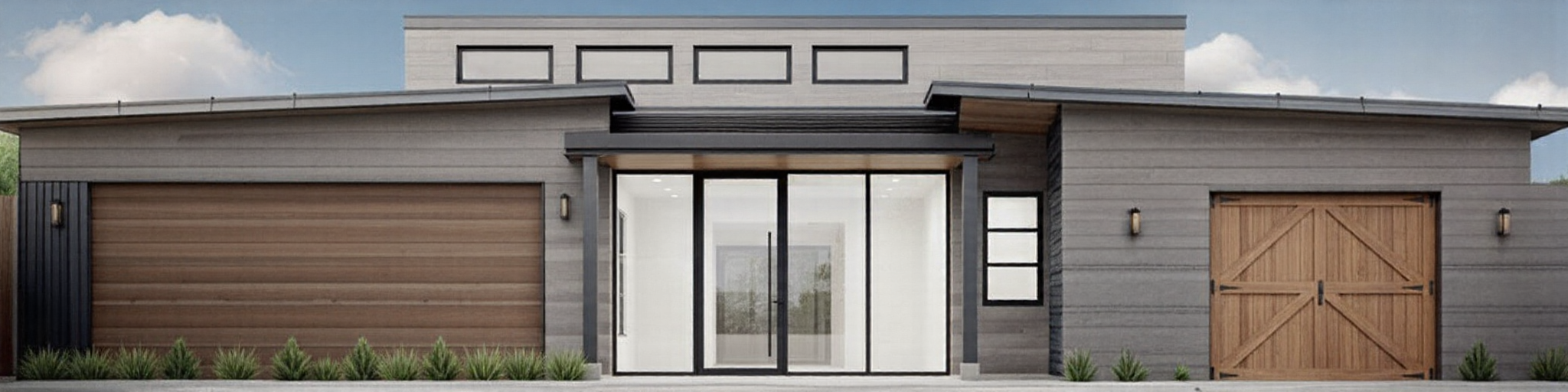 center the upper clerestory windows above the entryway keeping only three evenly spaced horizontal rectangular windows in a modern style through the entry glass show a modern mid century interior with clean lines warm wood tones minimalist furnishings and a suspended hanging fireplace as a focal point in the living area maintain the realistic lighting and overall architectural style