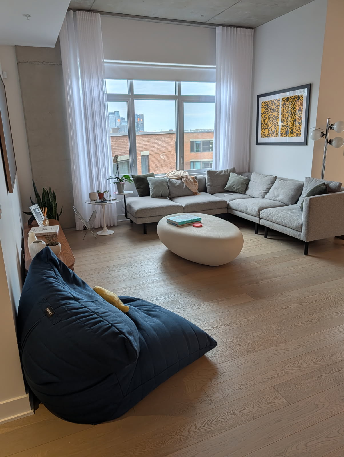 keep the original photo exactly as it is preserving composition colors lighting and perspective only make the following changes replace blue chair with chair in photo remove items on coffee table and wood console place rug in photo as a 5x8 under coffee table and sofa
