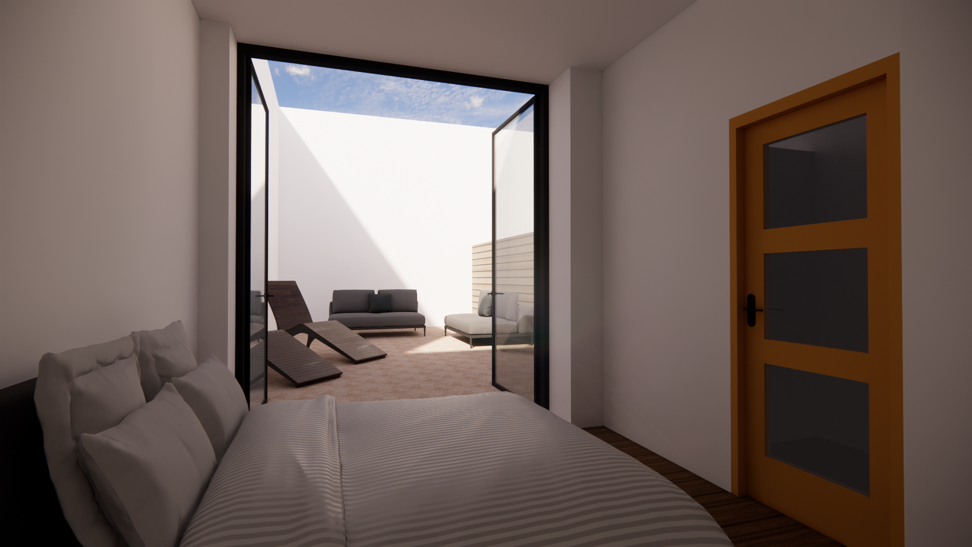 modern bedroom with doors opening up to yard with seating area and greenery the flat is in athens greece modern abstract artwork above bed colourful throw on bed hidden led lights on the ceiling floor tiles 1 20x1 20 stone beige