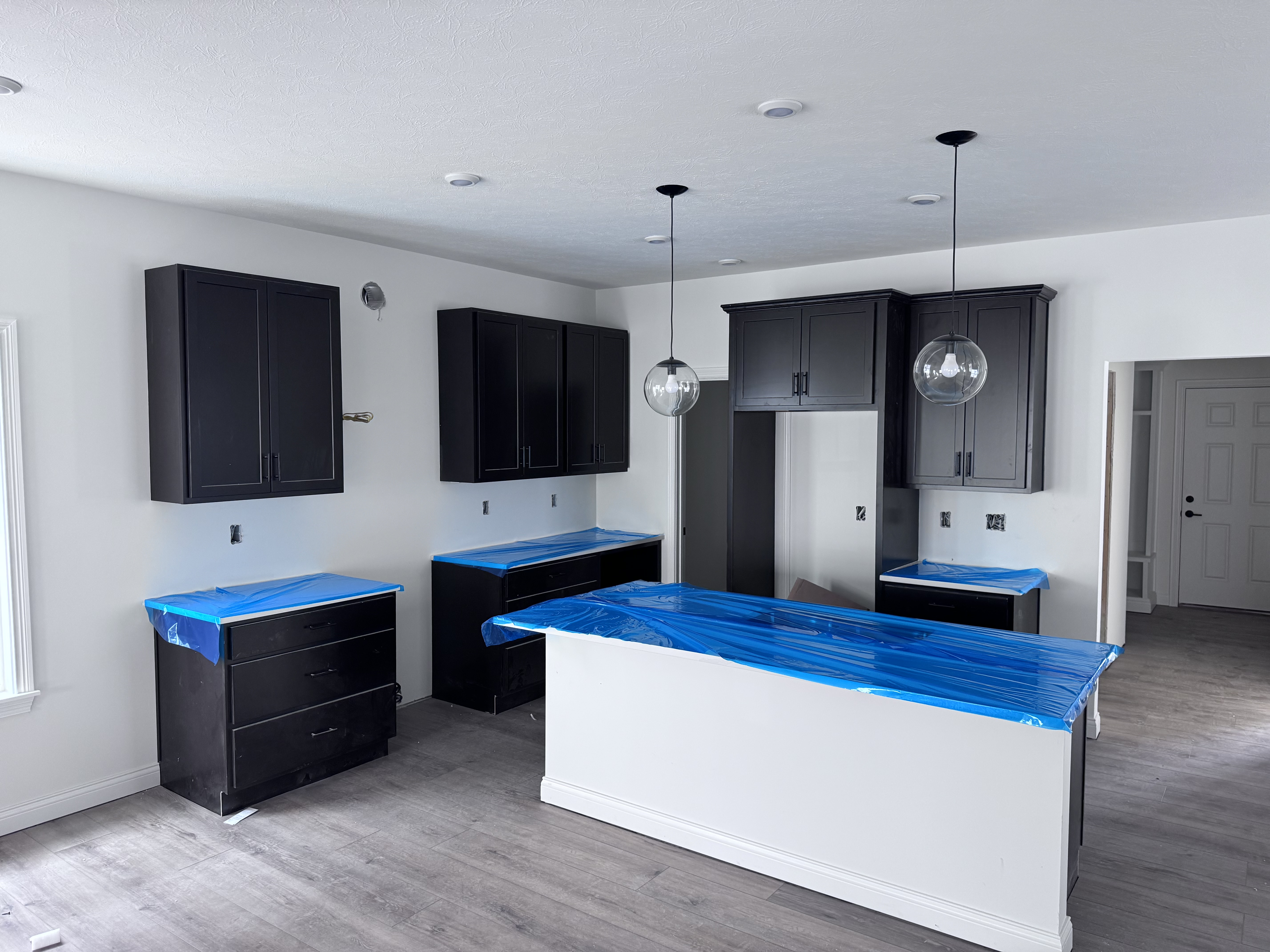 complete this kitchen with calacutta milano quartz by crescent quartz which is a white quartz with faint taupe veining add whirlpool stainless steel appliances including a range hood add a subway tile backsplash in daltile remedy zen which is a grayish taupe glossy rectangular tile stop it at bottom of range hood add a moen sleek pull down faucet in black add modern steel cabinet pulls in brushed nickel turn the lights on including undercabinet lighting