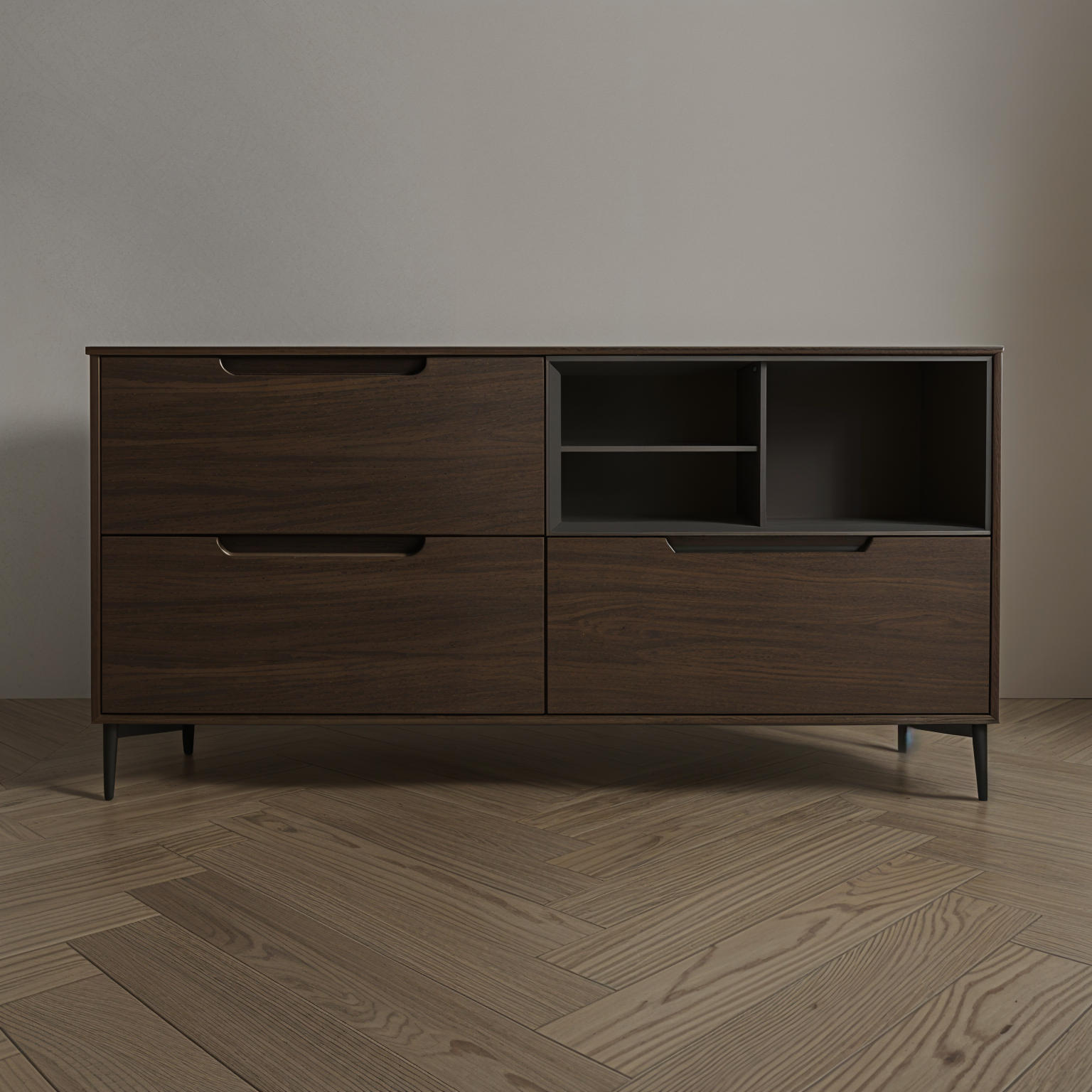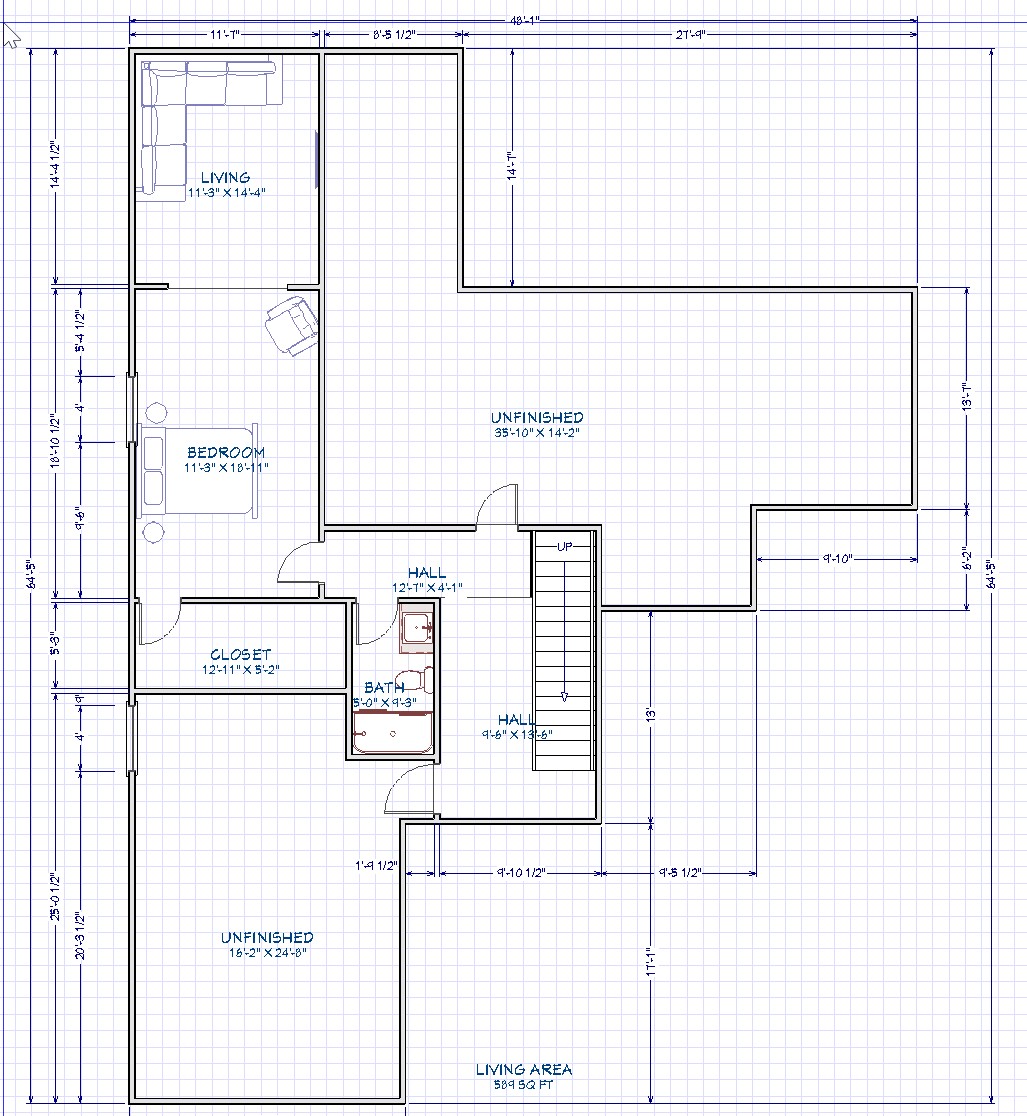 convert this floor plan into a realistic isometric 3d view of a full house show the space from an elevated angle with furniture walls and details visible there are two large rooms labelled unfinished keep those unfinished and show concrete floors and studs the bedroom and living room are one great room include furniture use the same furniture as shows on the plan do not change the orientation of the floorplan