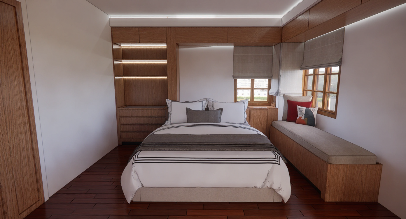 warm contemporary living room interior soft natural morning light streaming through sheer curtains calm and elegant atmosphere matte beige and taupe walls with subtle texture walnut wood cabinetry and coffee table plush fabric sofa in cream or sand tones with layered linen and wool cushions bronze or ceramic vases with dried branches neutral woven rug framed abstract artwork in warm earthy palette sunlight softly highlighting textures photorealistic 8k render cinematic daylight tone refined modern elegance with natural materials