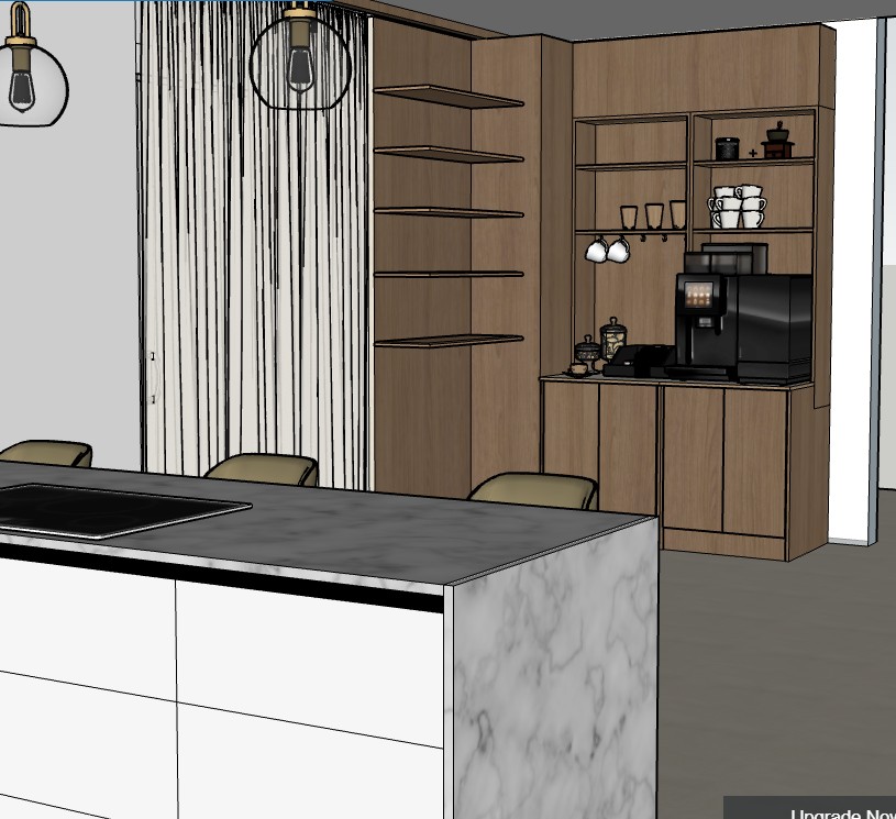 ultra realistic interior render of a modern japandi style kitchen based on the provided sketchup model maintain the exact layout and design kitchen cabinetry in light beige off white matte finish handleless and minimal kitchen with waterfall edges in onyx beige marble including countertop backsplash marble should have soft warm veining with a refined natural look three pendant lights above the island with black frames and warm bulbs bar stools with light upholstered seats in neutral tones back wall window with sheer off white curtains allowing soft daylight lighting soft natural daylight warm ambient lighting realistic shadows and reflections materials matte cabinetry natural wood grain soft fabric curtains polished marble style minimal warm japandi calm and refined camera eye level slightly angled to show depth of the pantry corner clearly render quality ultra photorealistic high detail