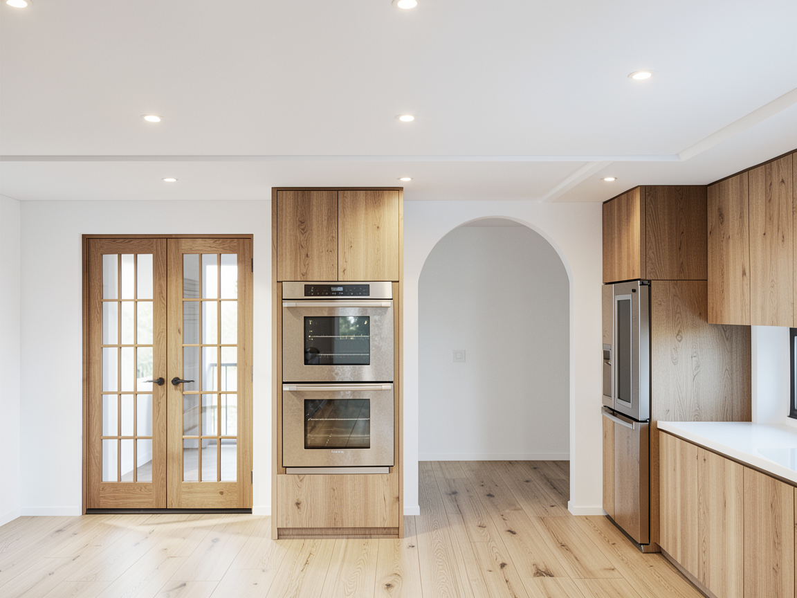 flat ceiling inside shot interior walls white cabinets natural wood color wood cabinet for double oven lighter color wood flooring ceiling lights behind arch wall pantry shelves