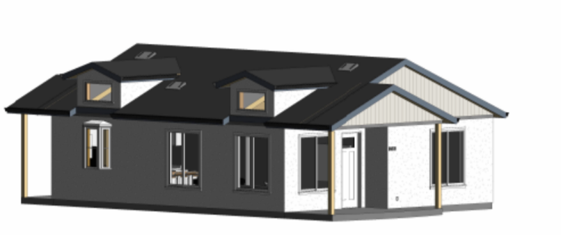 render this adu in a photorealistic image with smooth stucco siding on the gables composite shingle roof and raw wood tone posts nice landscape with a walk way leading to the front door
