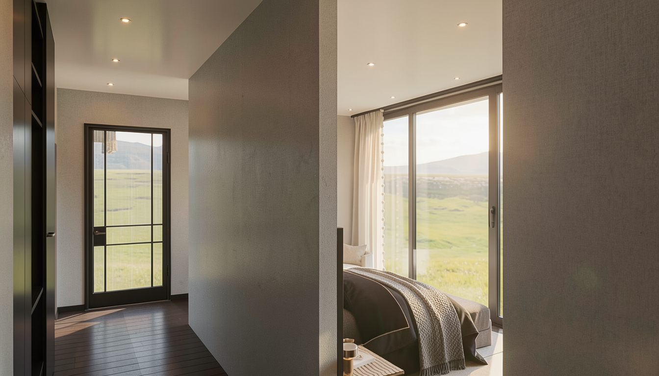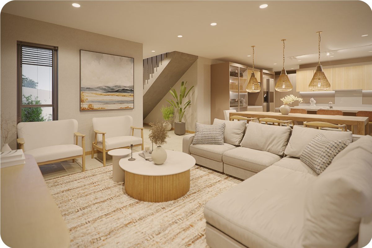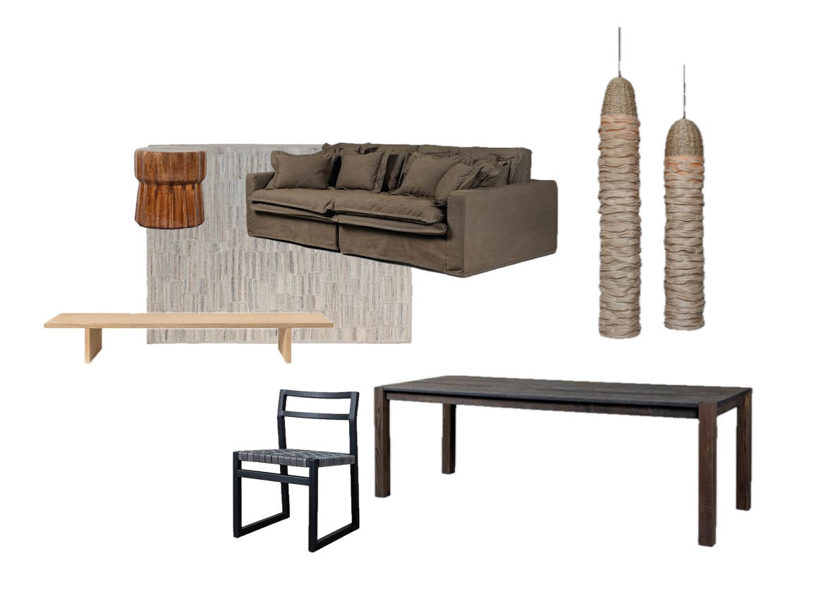 exterior shot change the style of the room with the items on the moodboard sofa carpet coffee table dining table pendant light dining chairs
