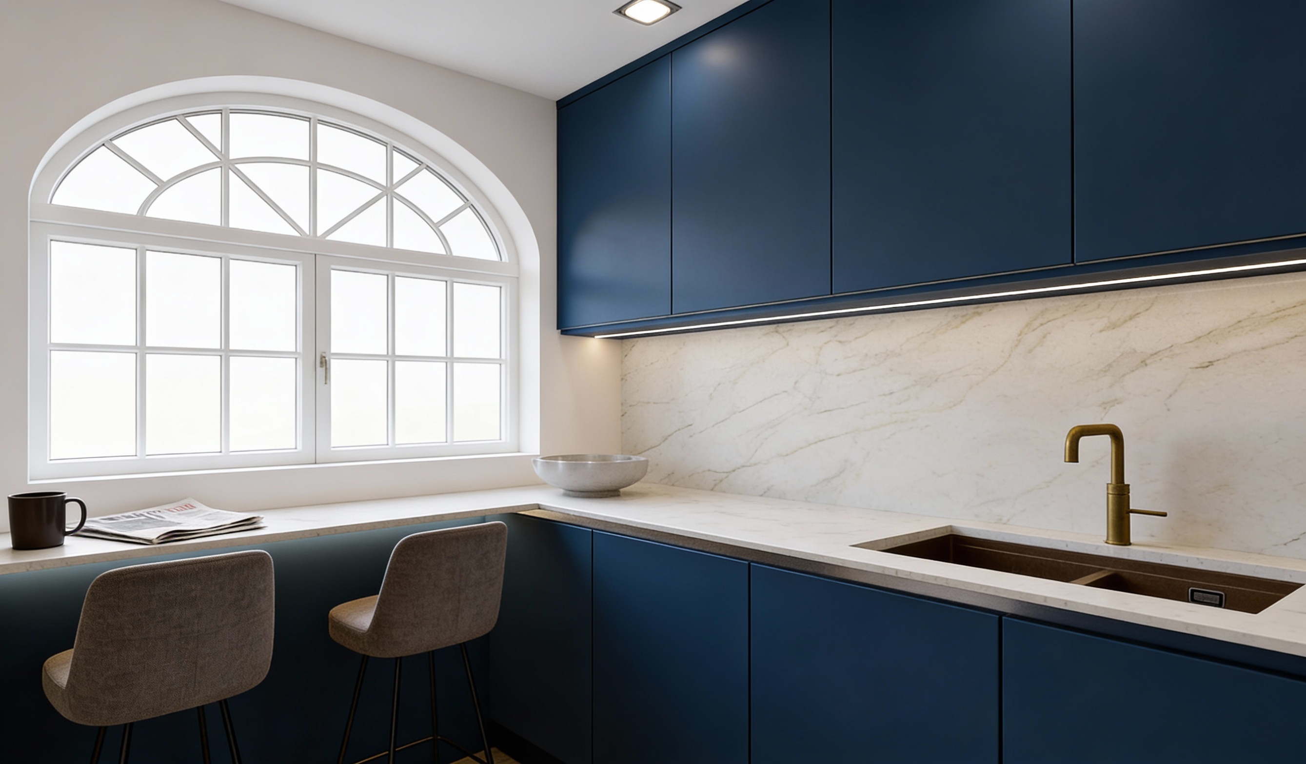 improve the lighting and make the blue slightly darker don t change anything else but change the window the be arched at top and crittal white window frame change the bar stools to something nicer add decoration on worktop where the bar stools are something like newspapers and coffee mug add decoration kitchen sink modern